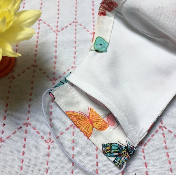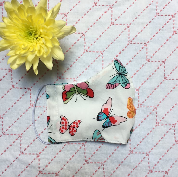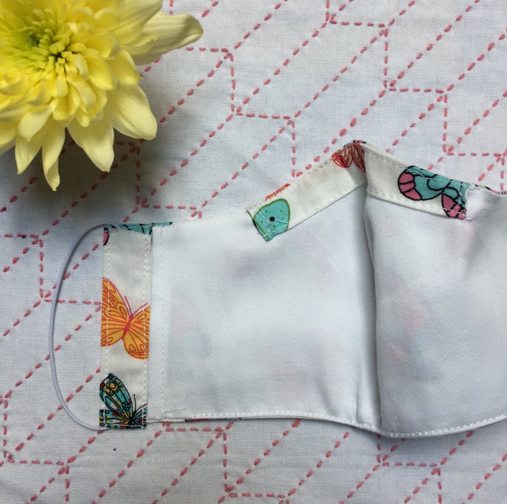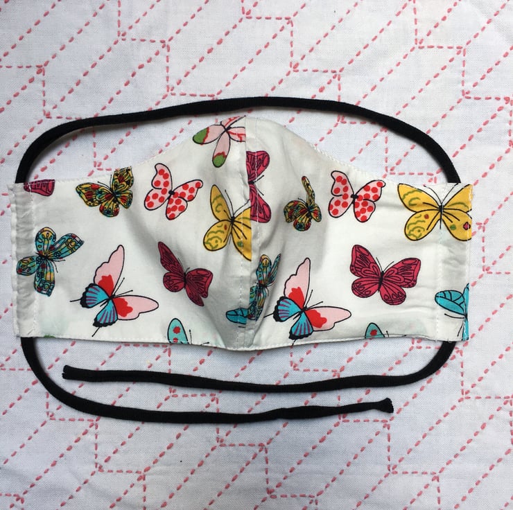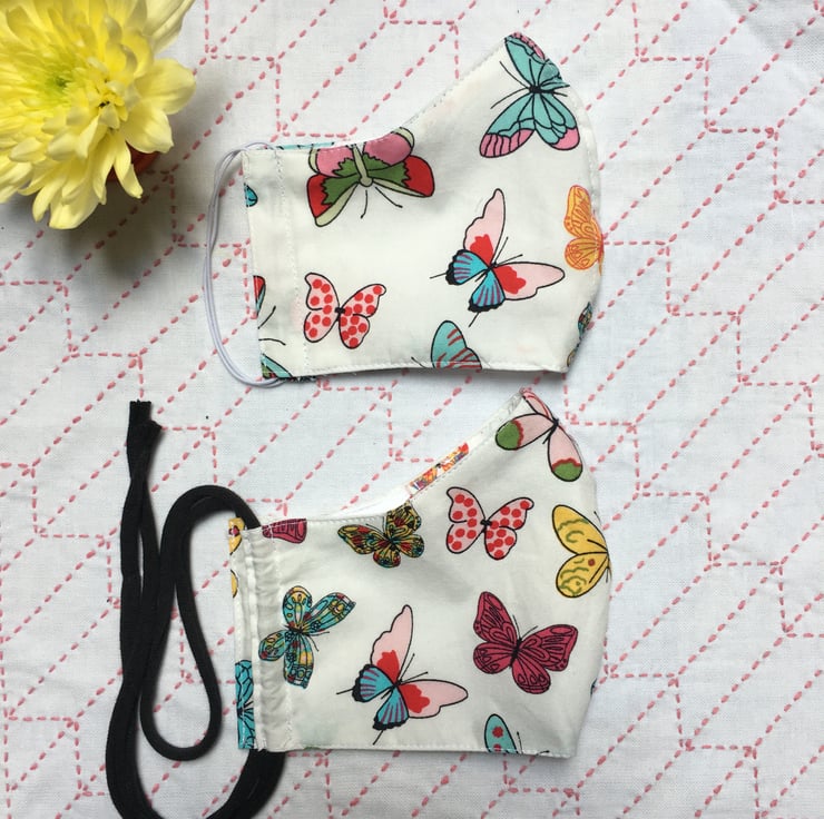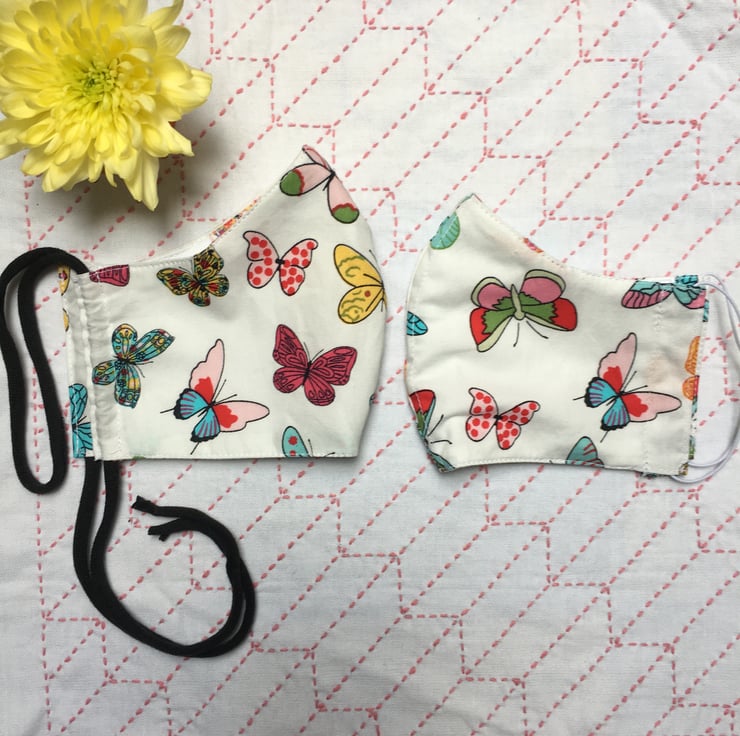 This pretty butterfly mask is made from 100% cotton, and has been lined with 600 thread count Egyptian cotton, making it extremely soft on the skin. The handmade mask is washable and reusable.
