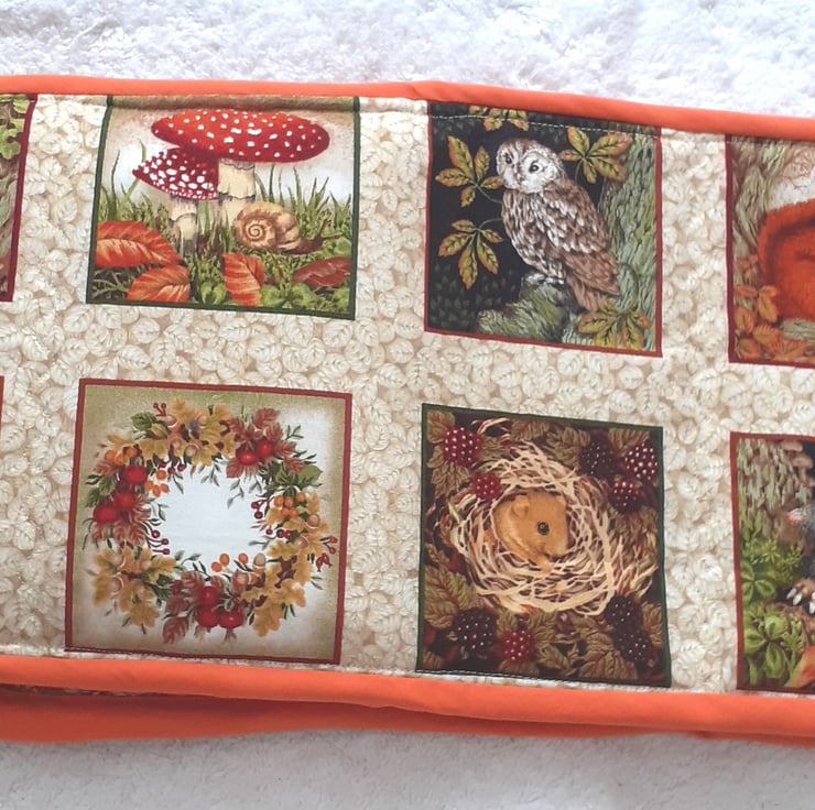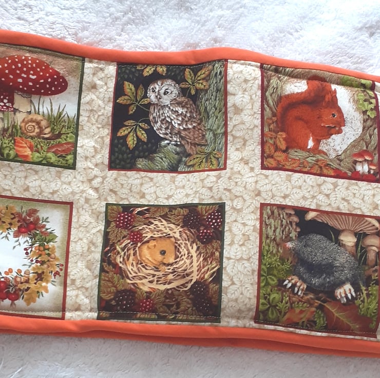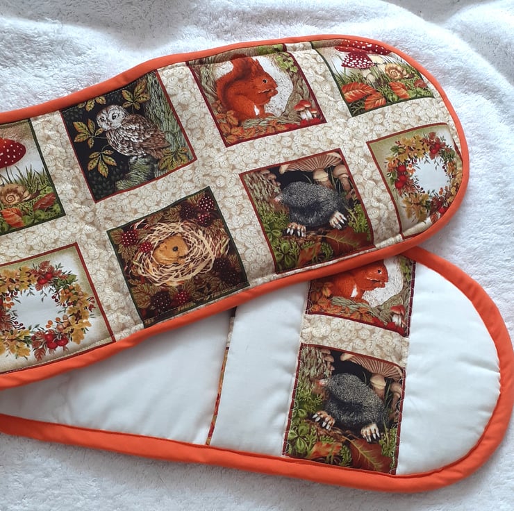 Woodlands Oven Gloves with Red squirrels, moles, harvest mice, tawny owls, hedgehog and toadstools with autumn wreaths and nuts on a cream leafy background.