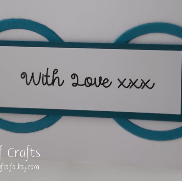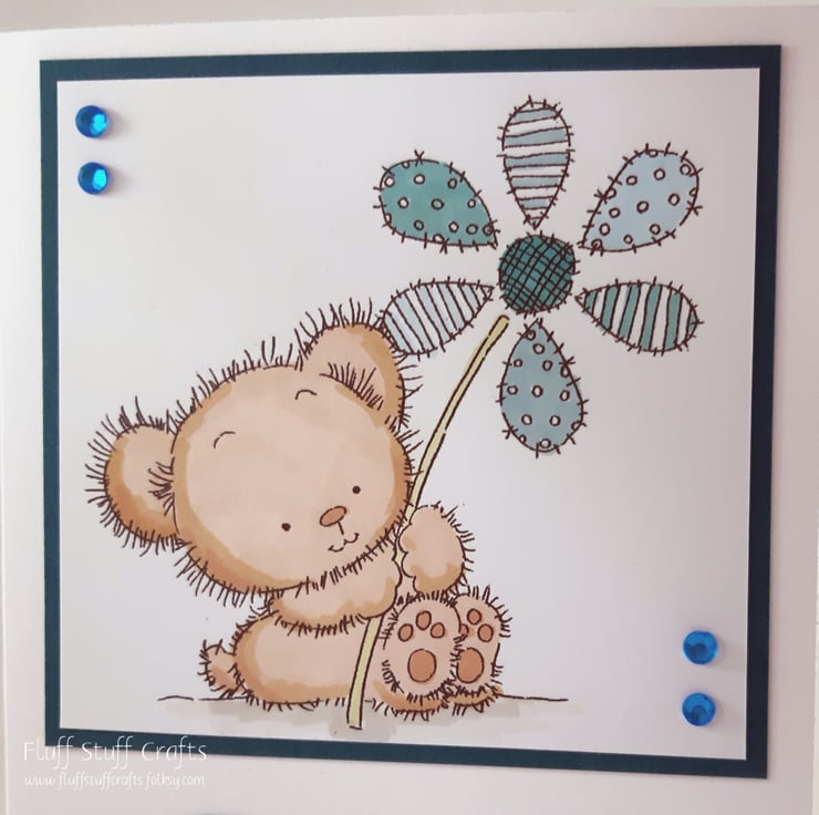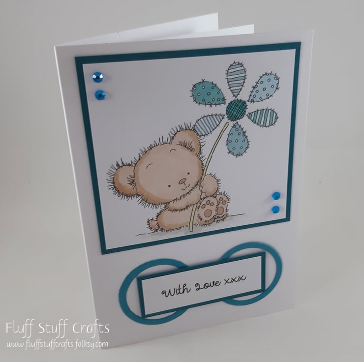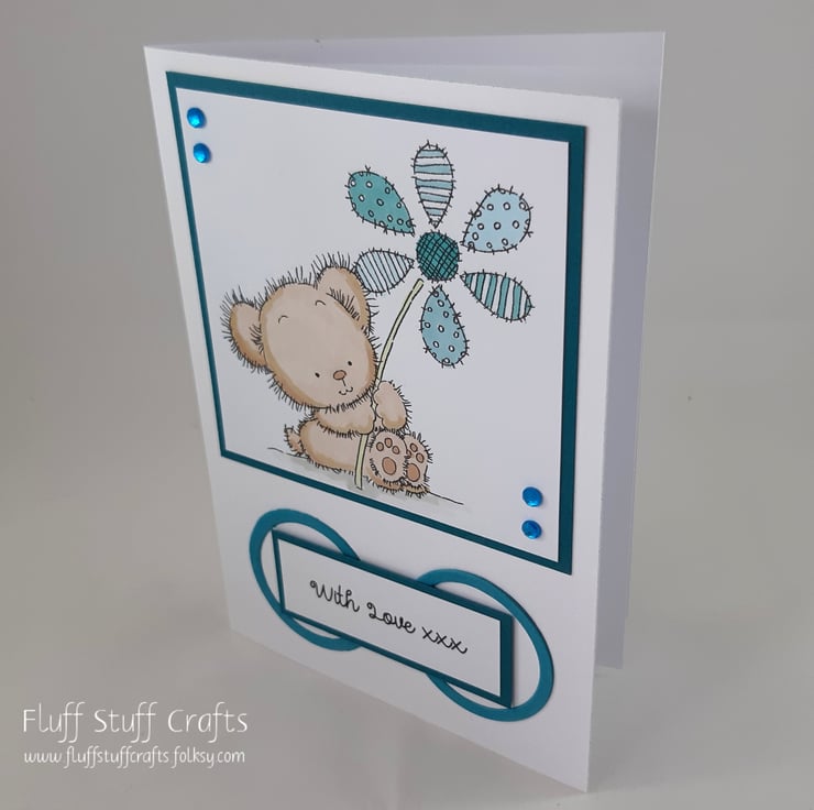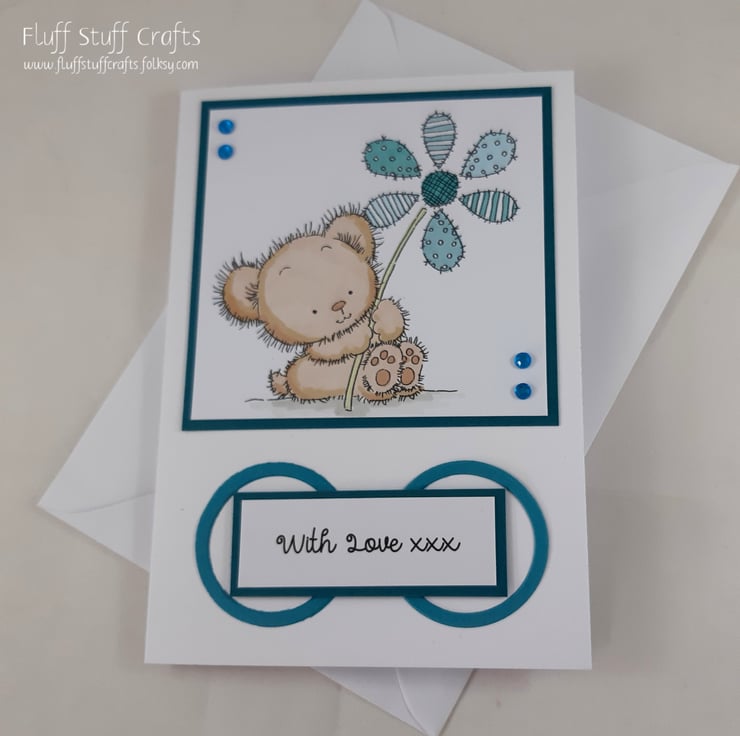 The card features a hand coloured image of a little brown bear holding a patchwork patterned flower. The image and sentiment 'With Love xxx' have been mounted onto teal coloured card and embellished with small gems.