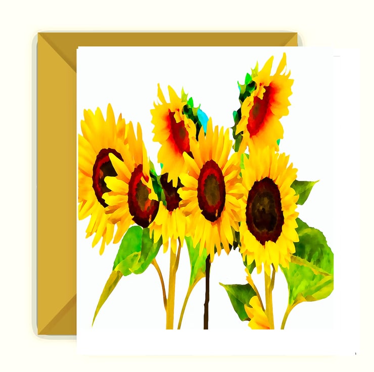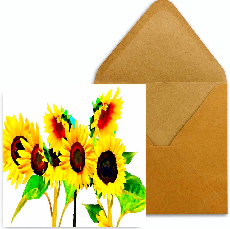 MeasurIng 6" x 6" (15.24cm x 15.24cm), your Sunflower Card will be wrapped in a biodegradable protective cellophane slip, and It is printed on really sturdy 310gsm acid free, natural white textured photo inkjet greeting card, which look, feel and print like mini giclee prints.