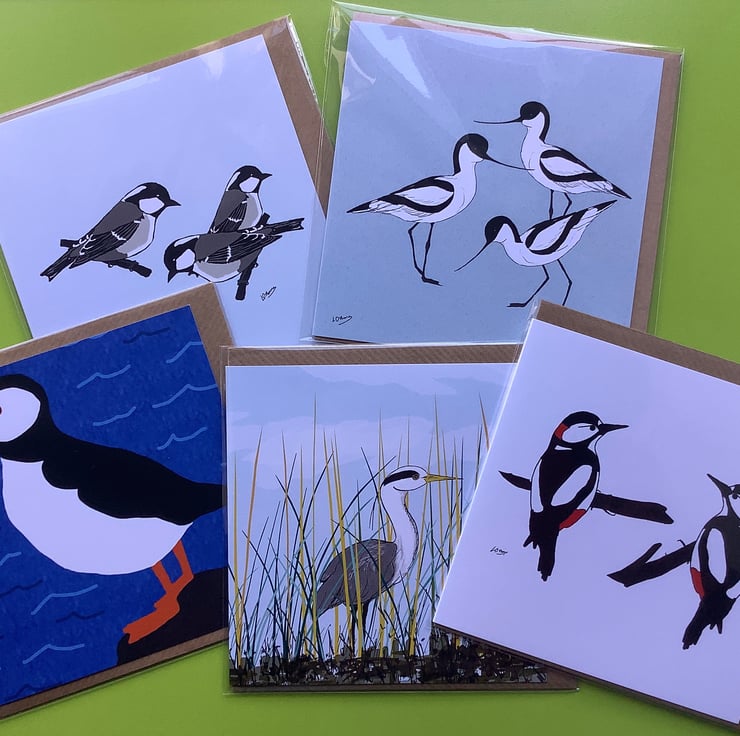 Based on my digital illustrations of birds - puffin, avocets, woodpeckers, heron and coal tits.