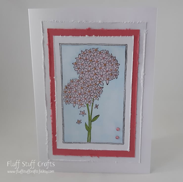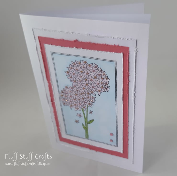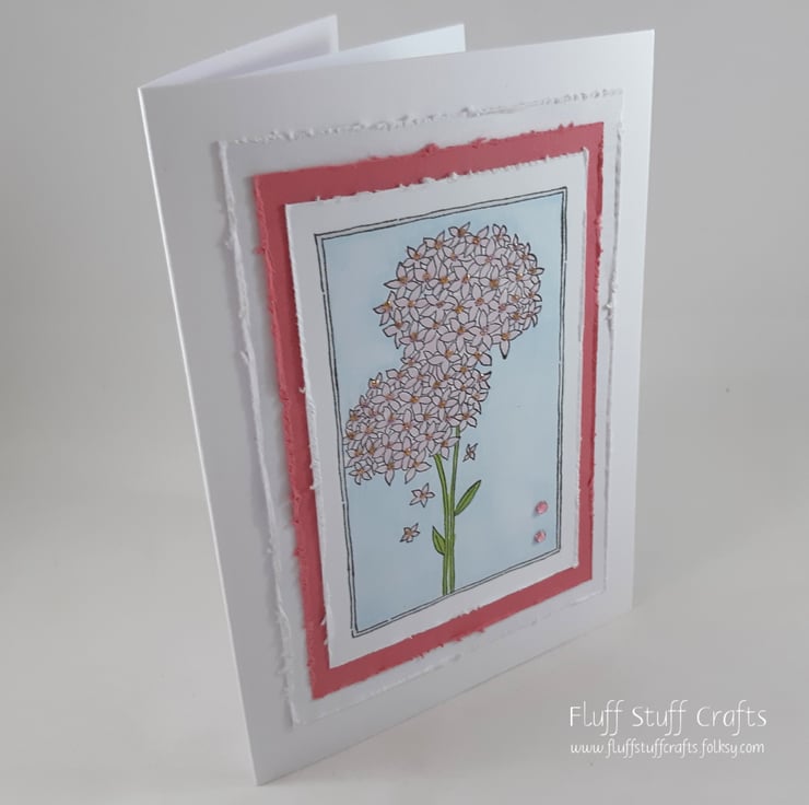 The image has been hand coloured and mounted onto pink and white distressed card with two small pink gems. The centre of each of the flowers has been glittered.