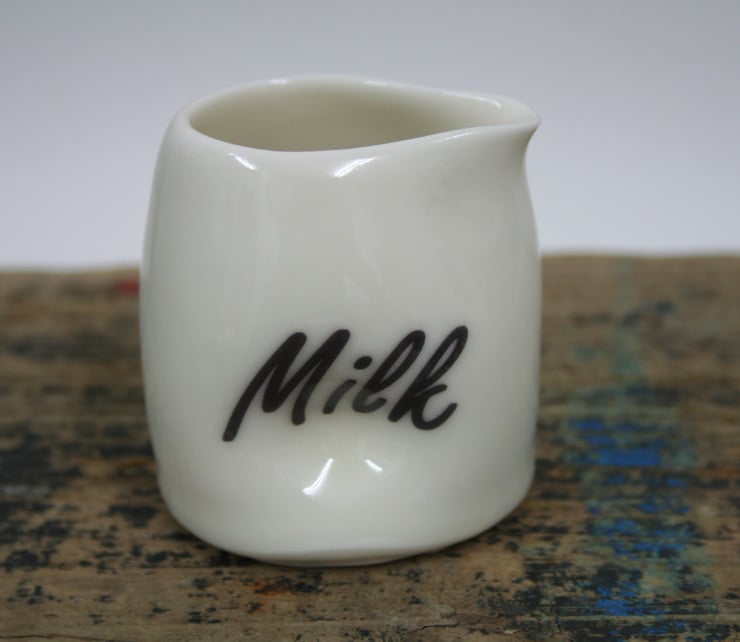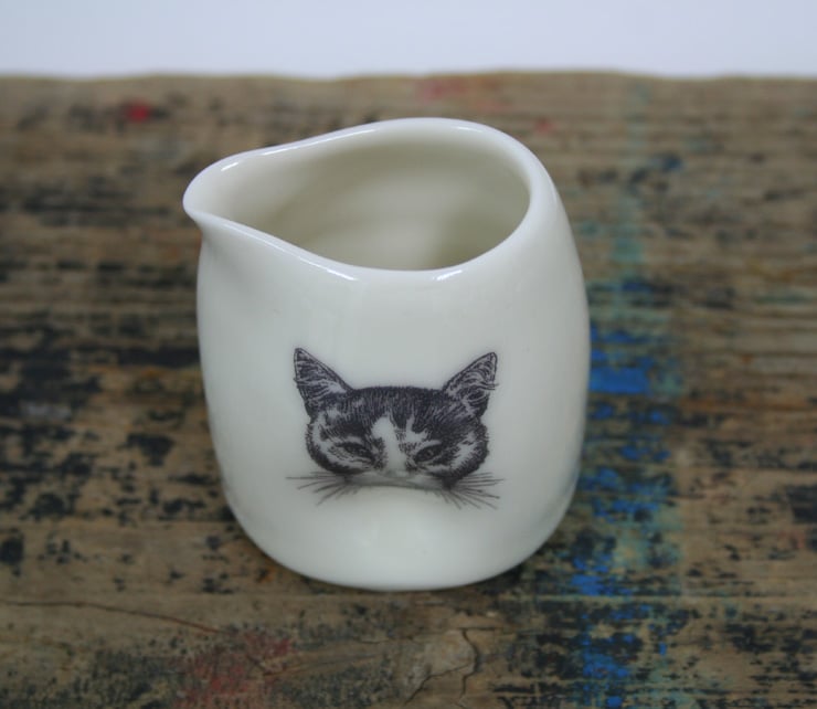 Hand thrown and glazed porcelain jug with a cat head image on one side and milk wording on the other side. The sides of the jug have been pinched in during the making process to allow ease of picking up the jug. The transfers are fired on at 800 degrees centigrade and are dishwasher / microwave / oven proof. Approximate measurements are 6cm tall and 5cm wide. It holds about 75ml. Please note these dimensions may vary slightly as they are hand made on a potters wheel.