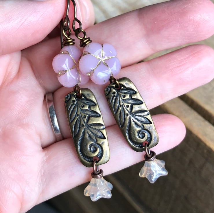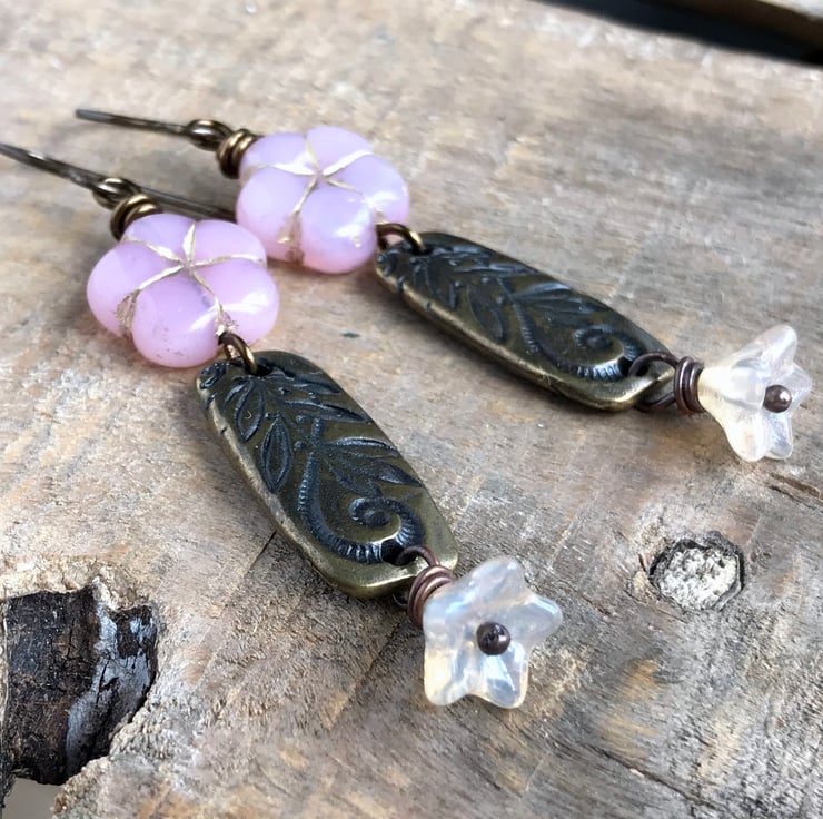The earrings have hand antiqued brass French hook earwires, and measure approximately 5 cm from the bottom of the earwire and 6 cm in total from top to bottom.