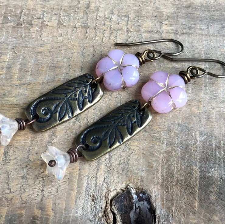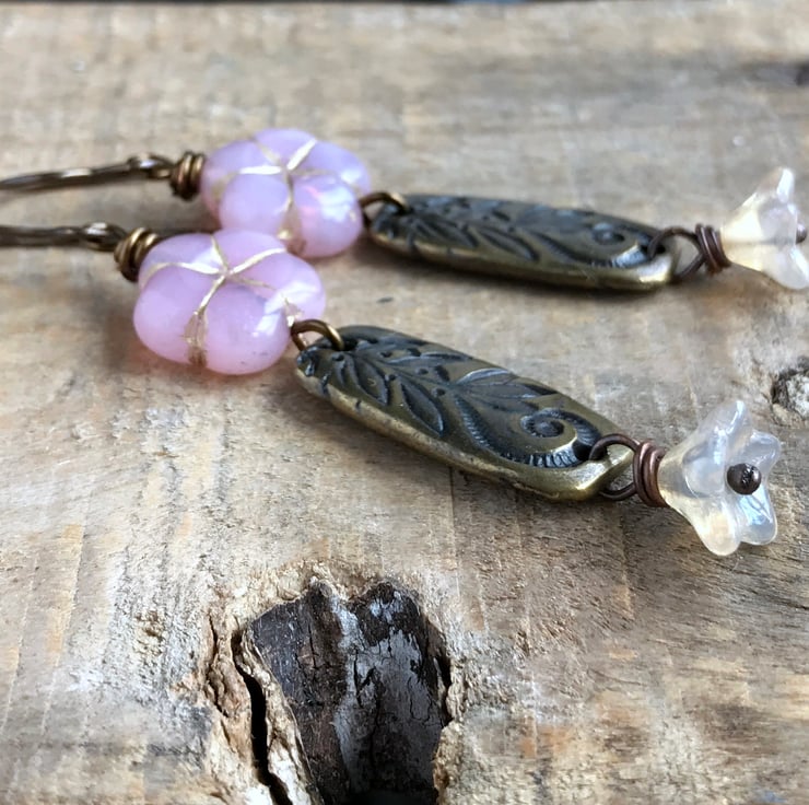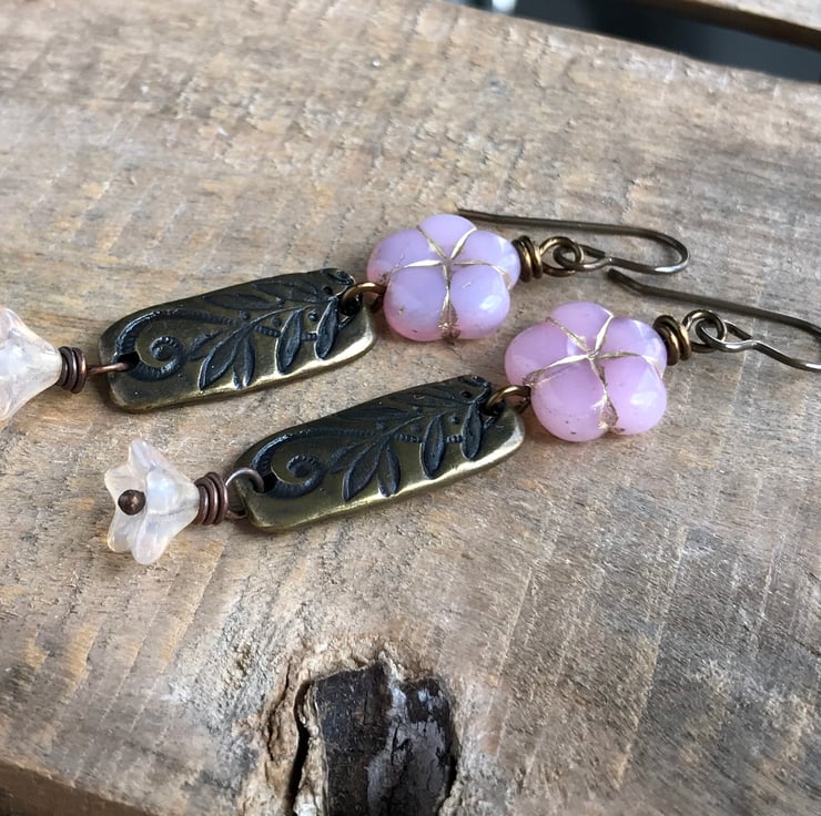 Wire wrapped above are Czech glass flower beads in a soft shade of rose pink with a pretty golden-bronze wash in between their petals.