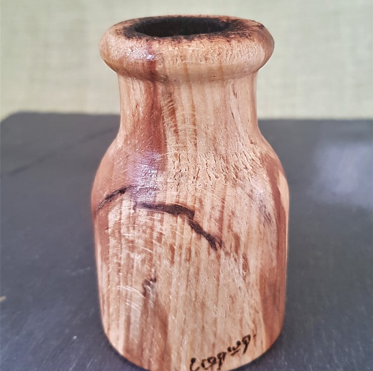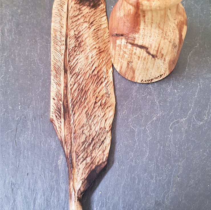This lovely handmade 'Feather and Inkpot' are two separate pieces of wood. The 'pot' is lathe turned from a pretty piece of Beech and then finished with a coat of wax oil. The 'feather' has been carved from Sycamore using a knife and gouge chisel, this too has been protected with a wax oil.