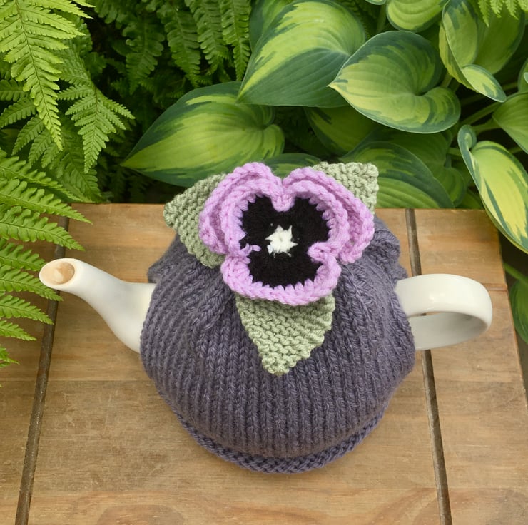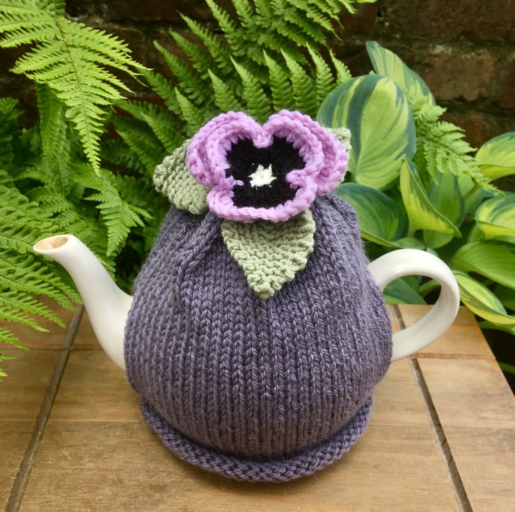 A pretty lilac and black pansy adorn this soft hand knitted grey tea cosy.