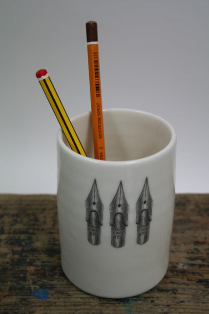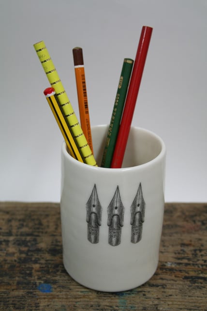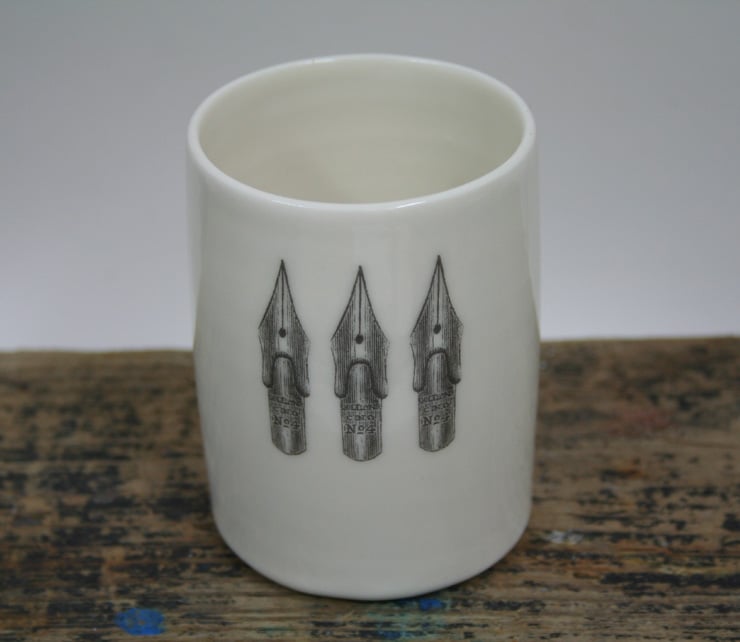Thrown porcelain cylinder with pen nibs image. Approximately 10.5cm high and 6.5cm diameter. Dimensions may vary slightly as they are individually hand made on a potter's wheel. The glaze firing is very high at 1,240 degrees centigrade and the item is strong and dishwasher safe. The pen nib image is taken from a Victorian drawing.