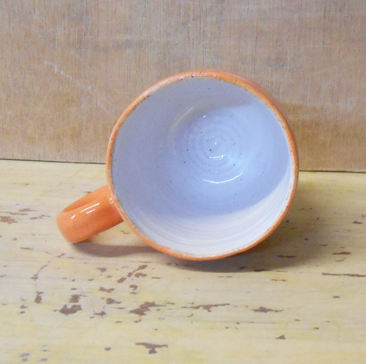 This is a medium sized wheel thrown durable stoneware Mug. It is glazed on the interior with shiny Tin white glaze, and a shiny Neon Orange glaze is across the exterior.