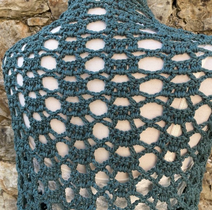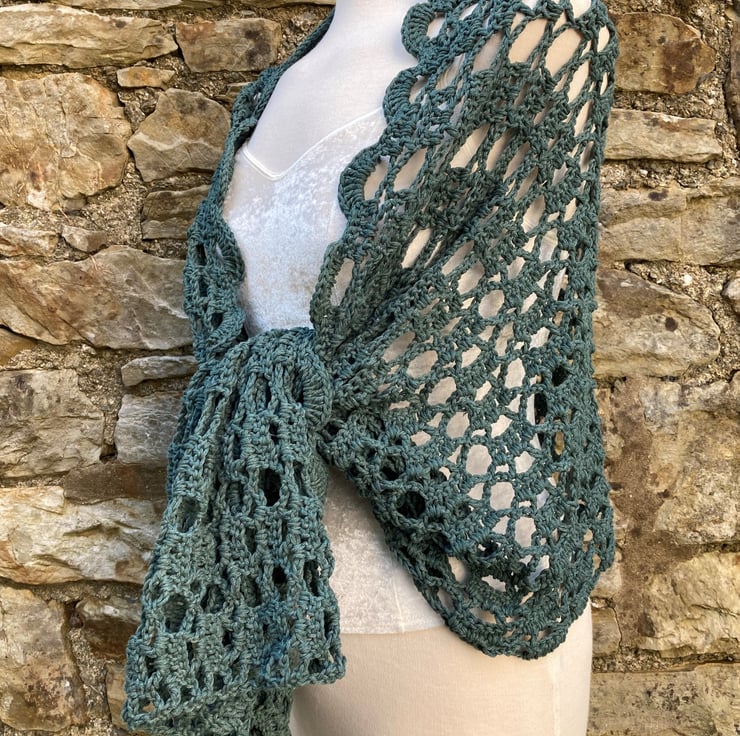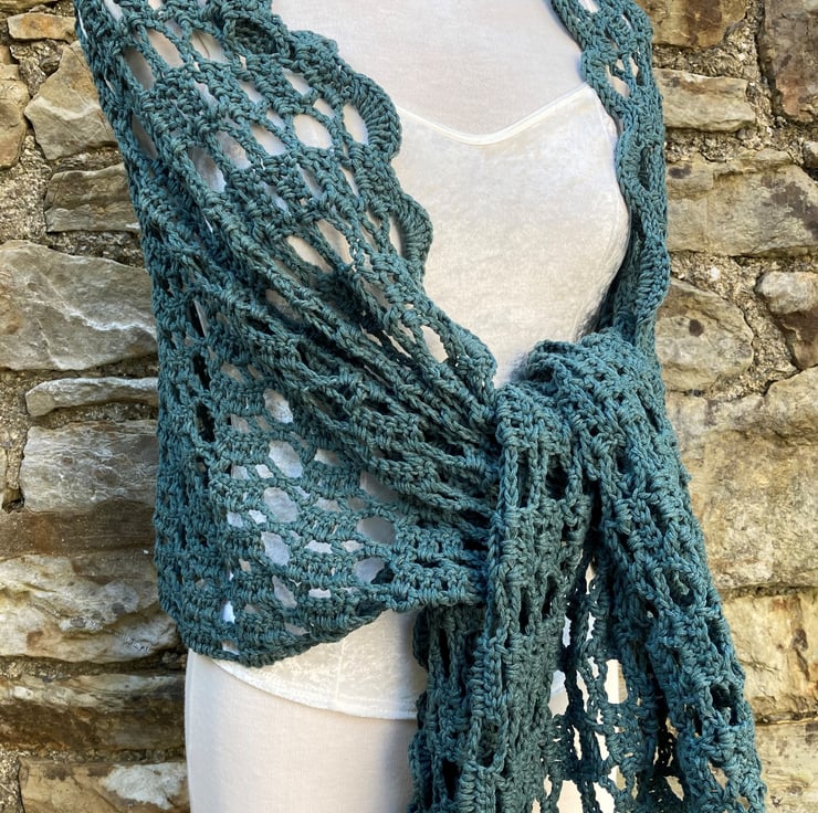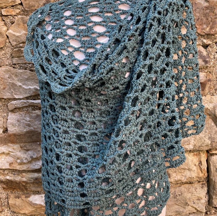 Using sage colour soft cotton and following the Amelia pattern by Truly Crochet, I hand crafted this light Summer shawl