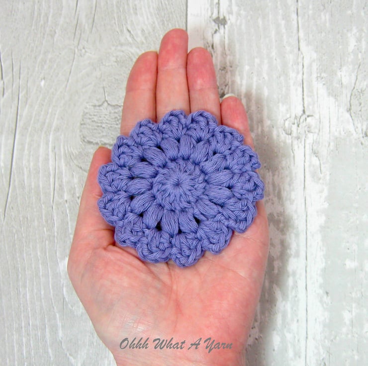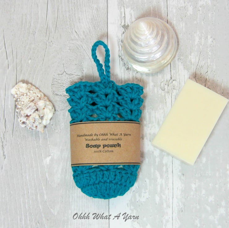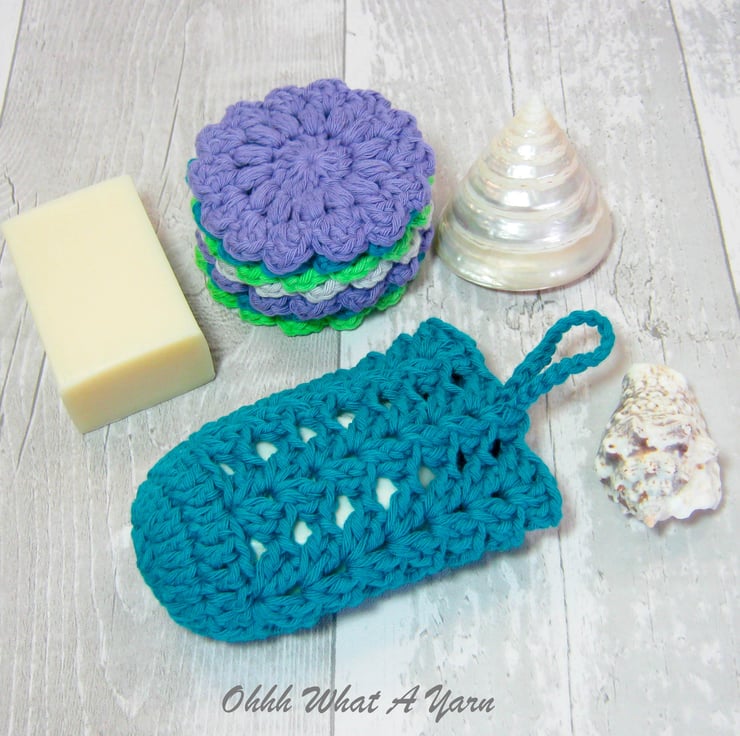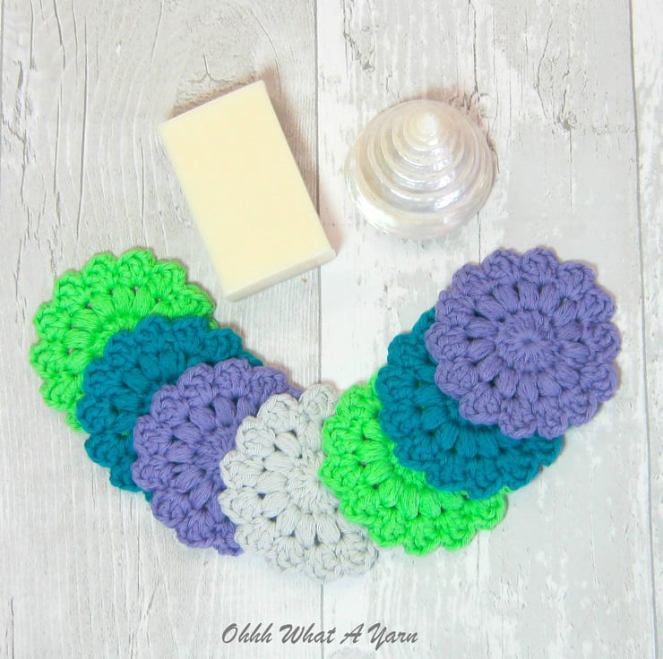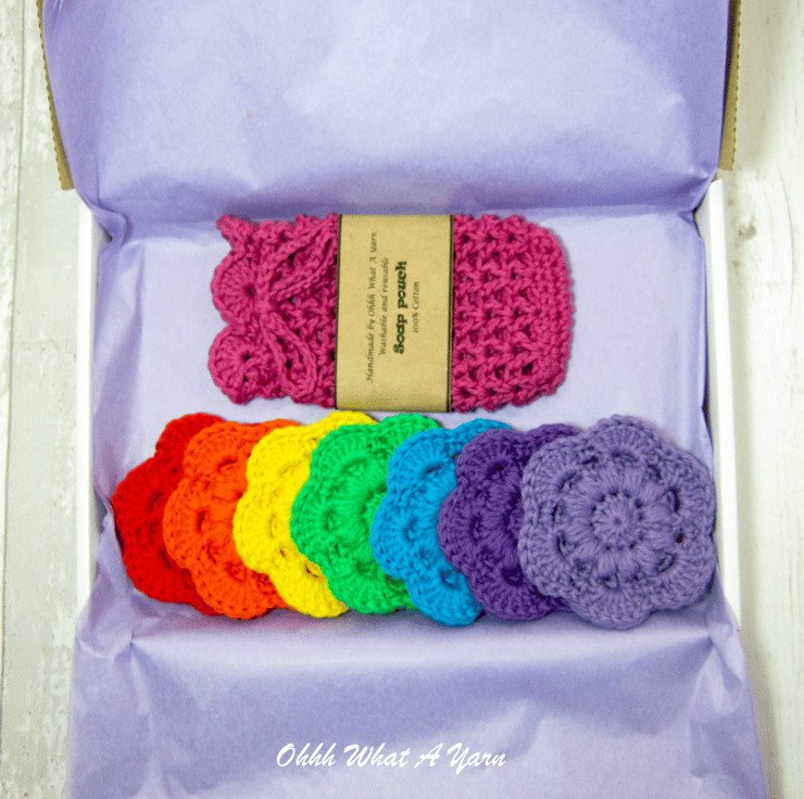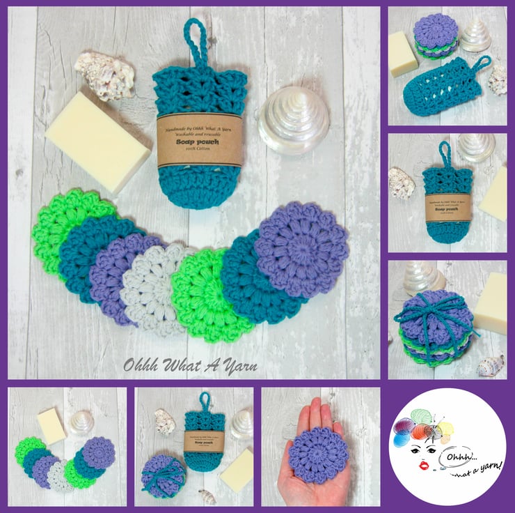 Each set comprises of 7 flower shaped face scrubbies and a coordinating v stitch soap pouch/soap saver with a loop for hanging which you can pop a bar of soap in or even scraps of soap that you might usually throw away.