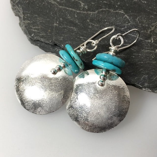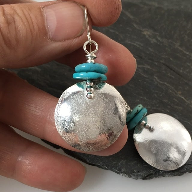 Beaten dished discs of silver have been topped with a pair of bright blue turquoise slice beads and hung from handmade hooks.