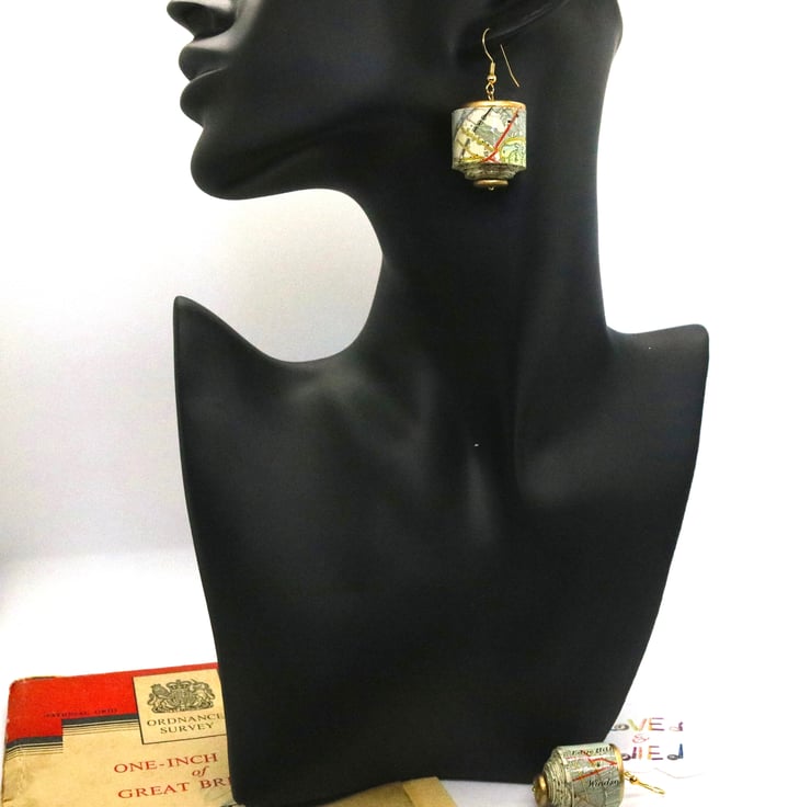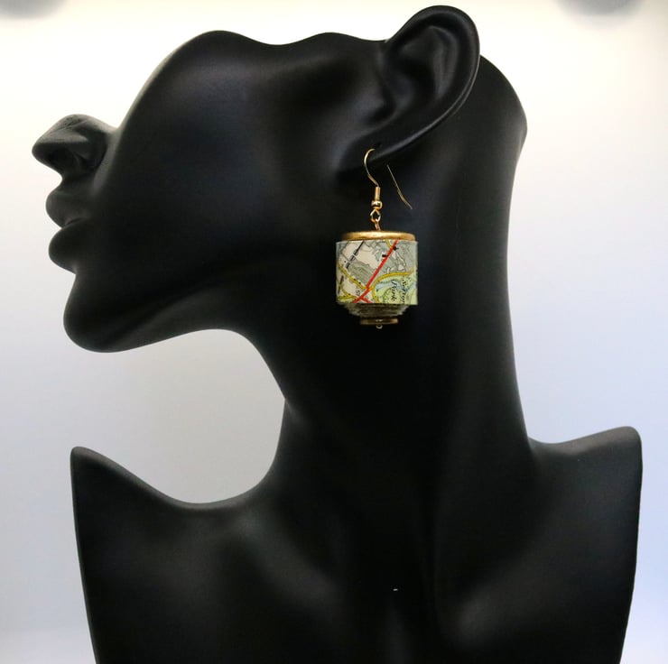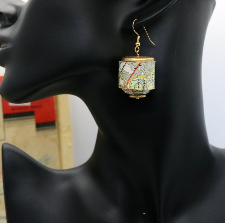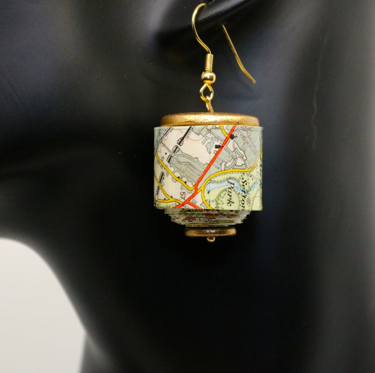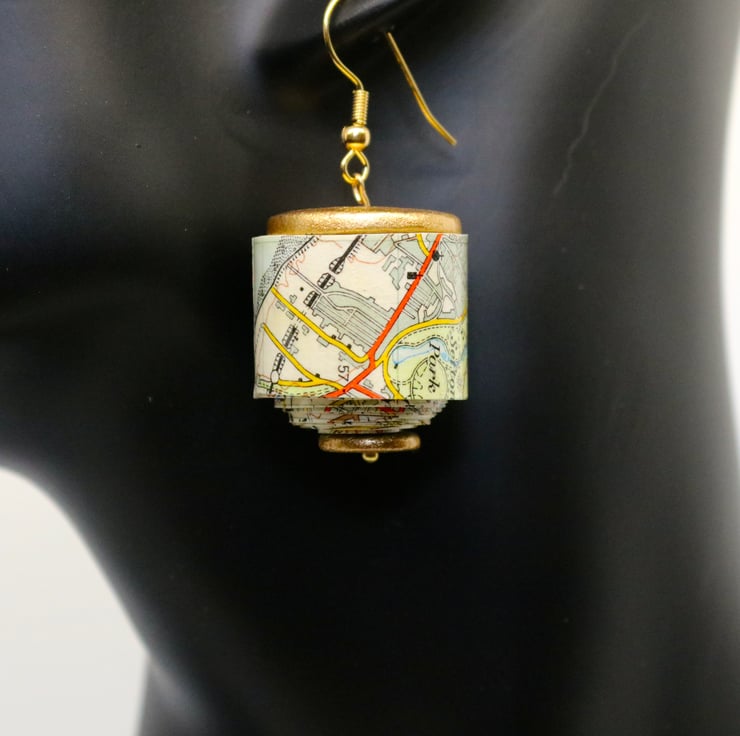Tapered barrel shapped chunky but very light earrings made with an old OS map of Chester and neighbouring Liverpool. The map was cut manually into strips which were then hand rolled into beads and varnished. The earrings are mounted onto a gold plated finding, topped with a flat disc shaped recycled wooden golden bead and bottomed with a smaller golden bead.