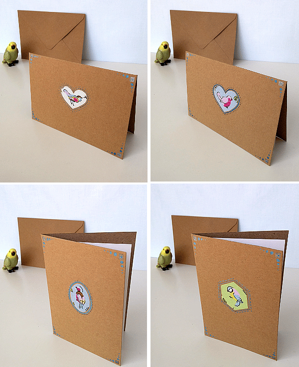 This listing is for a set of four blank cards with applique bird detail on the front. The pretty birds are positioned on elegantly decorated, brown cards. Each card has an ivory paper insert for your message.