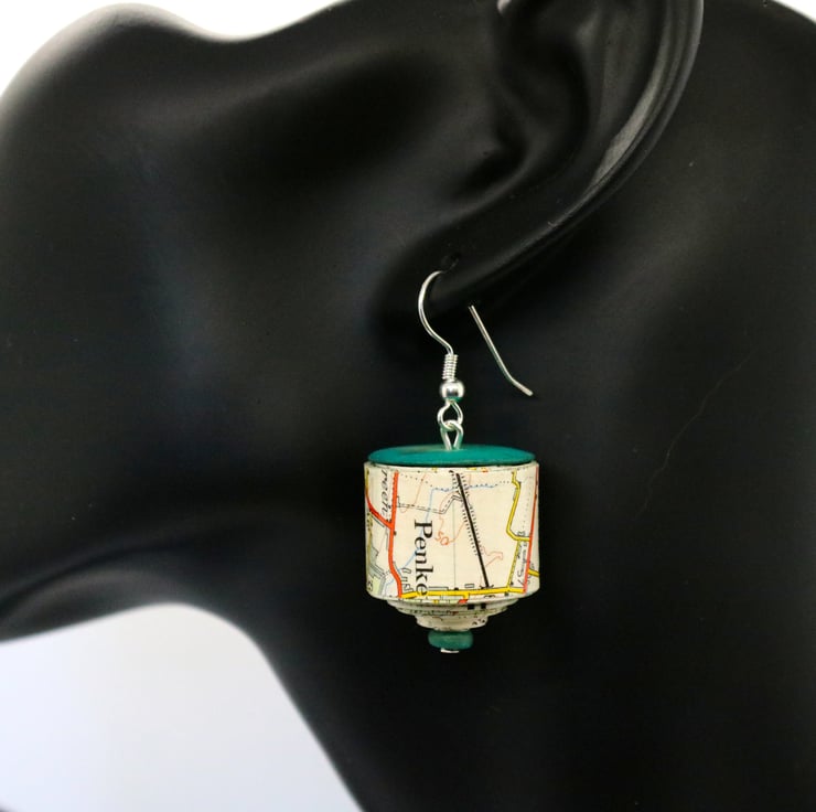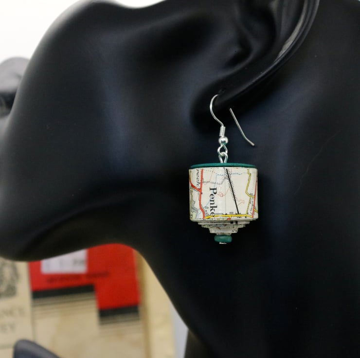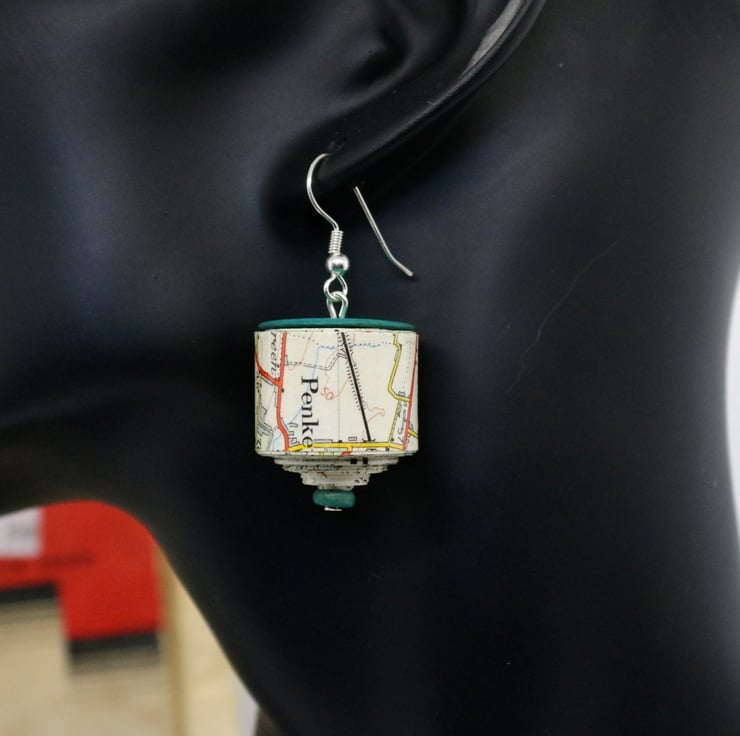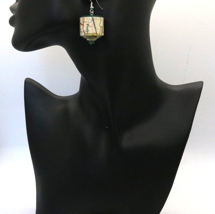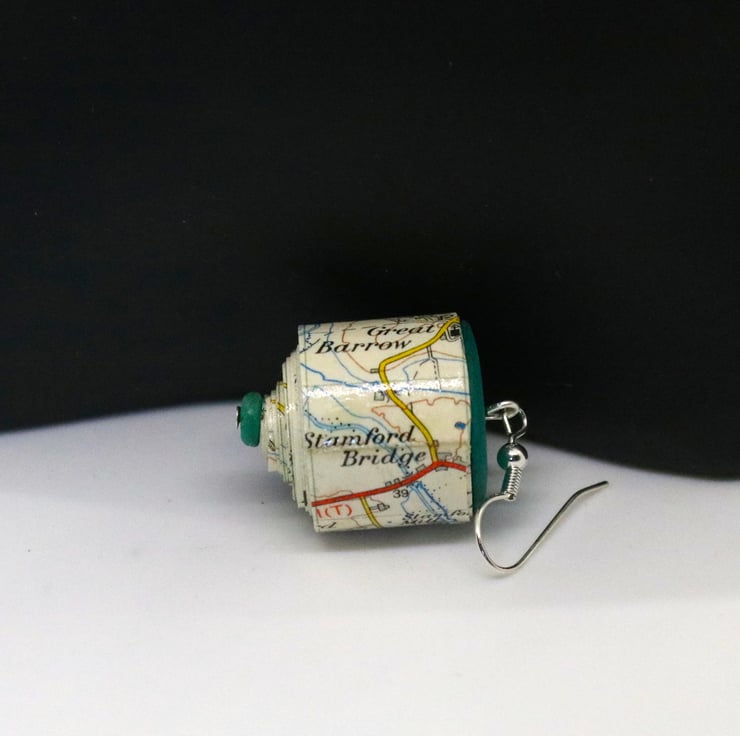A tapered barrel shapped chunky but very light pair of earrings made with an old OS map of Chester and neighbouring Liverpool. The map was cut manually into strips and hand rolled into beads which were then varnished. The earrings are mounted onto a silver plated finding, They are topped with a flat wooden disc recycled green bead and bottomed with a smaller green bead.