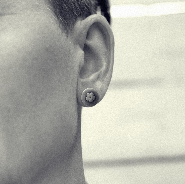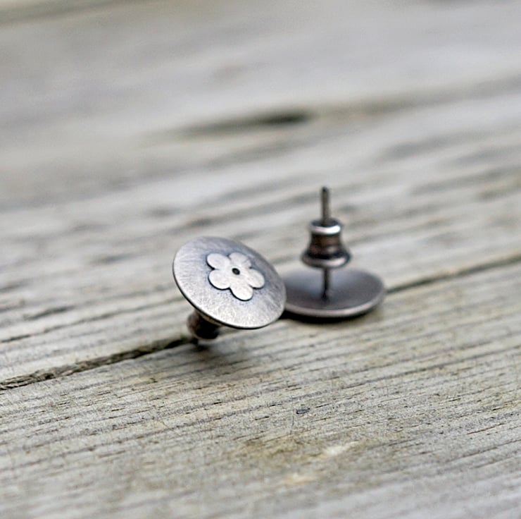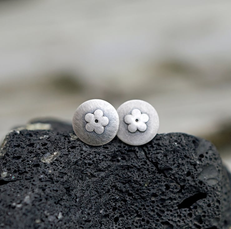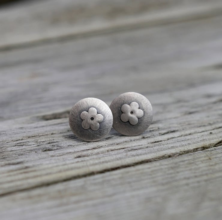 Sterling silver circle stud earrings with a little daisy flower. The earrings have been given a matte brushed finish.