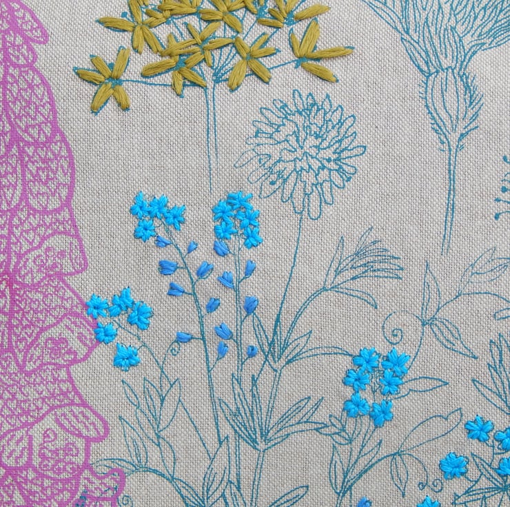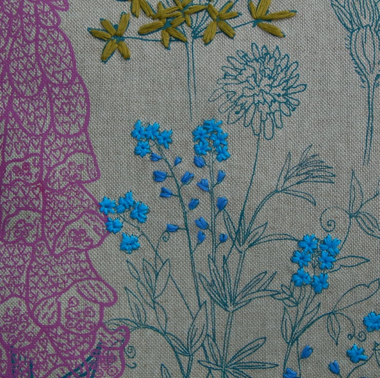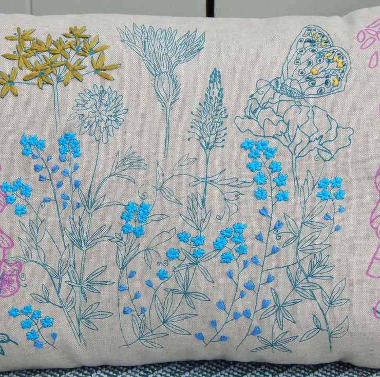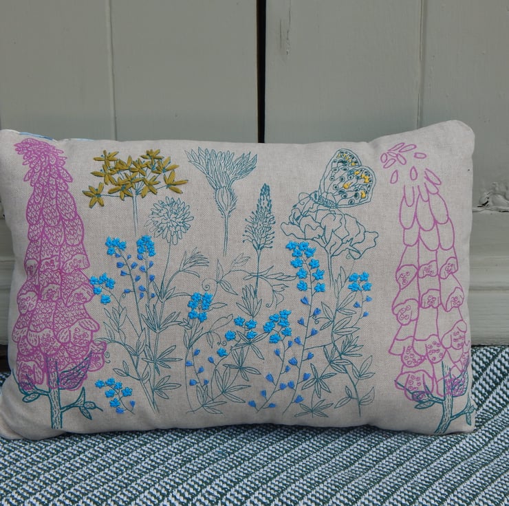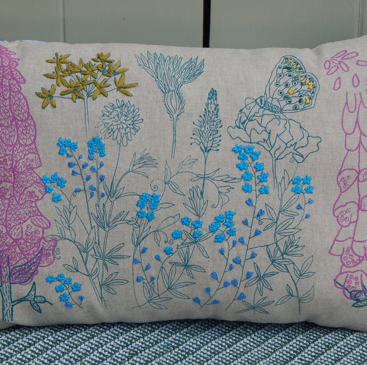 There is a butterfly printed settled on a flower, I have hand embroidered yellow and dark blue French knots on its wing. There are then lots of wild flowers each printed individually with my smallest size screens, I place the screen, print, wait to dry and then place and print the next one. This gives a real individual one of a kind never to be repeated design, unique to this one cushion. The flowers include foxglove in pink, wild garlic, scabious, plantain and forget me nots. The wild garlic and forget me nots have all been hand embroidered in a linen thread.