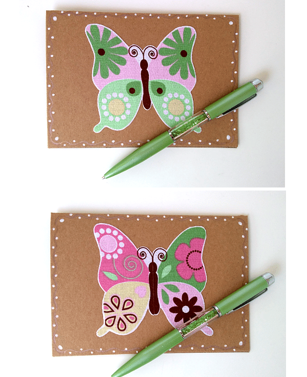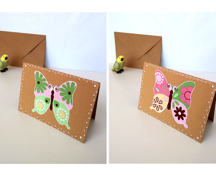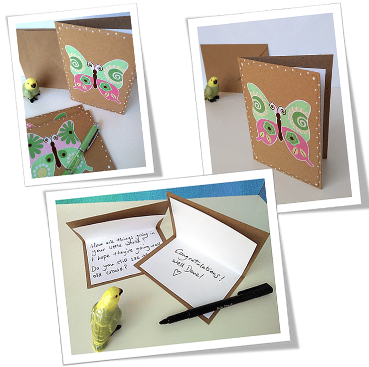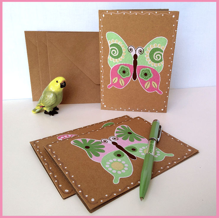 This listing is for a set of three blank cards with applique butterfly detail on the front in shades of green, pink and yellow. The colourful butterflies are positioned on elegantly decorated, brown cards. Each card has an ivory paper insert for your message.