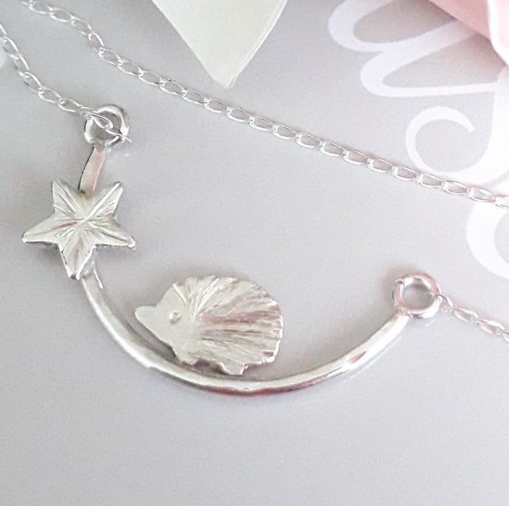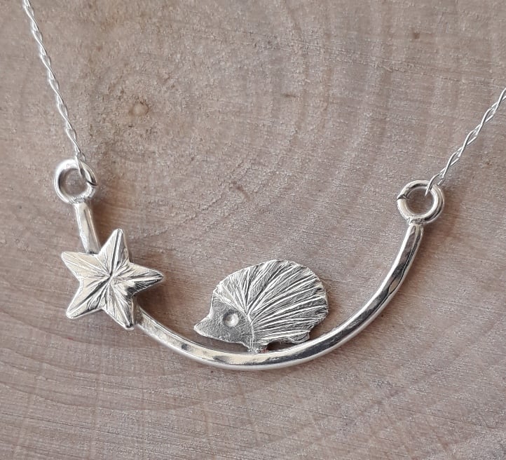 Handmade from solid sterling silver, the hand pierced silver hedgehog is cut from solid Sterling Silver 925 sheet before giving her features and then being soldered onto a solid sterling silver 925 hand formed curved branch, made from silver round wire lightly hammer textured and a pure silver hand engraved star soldered onto the top of the curved branch.