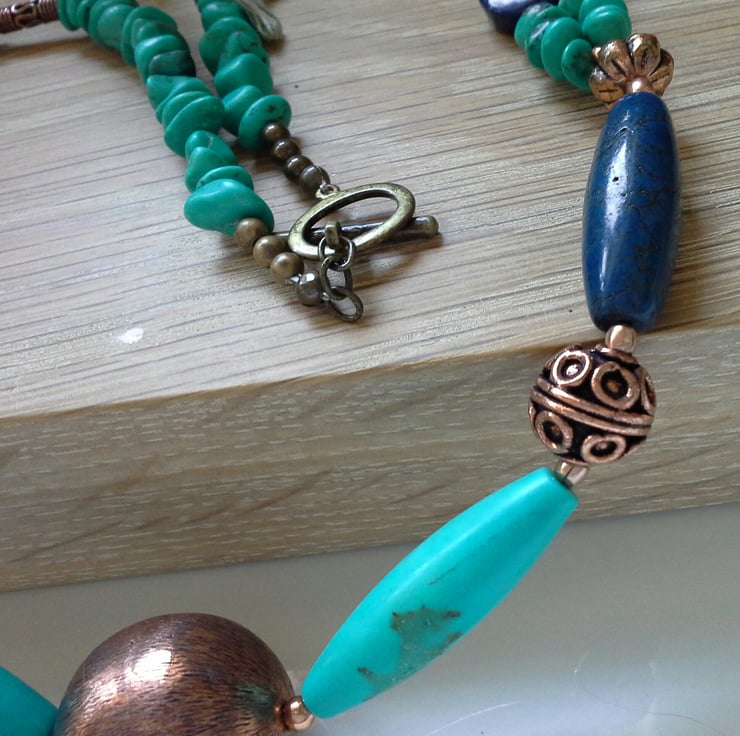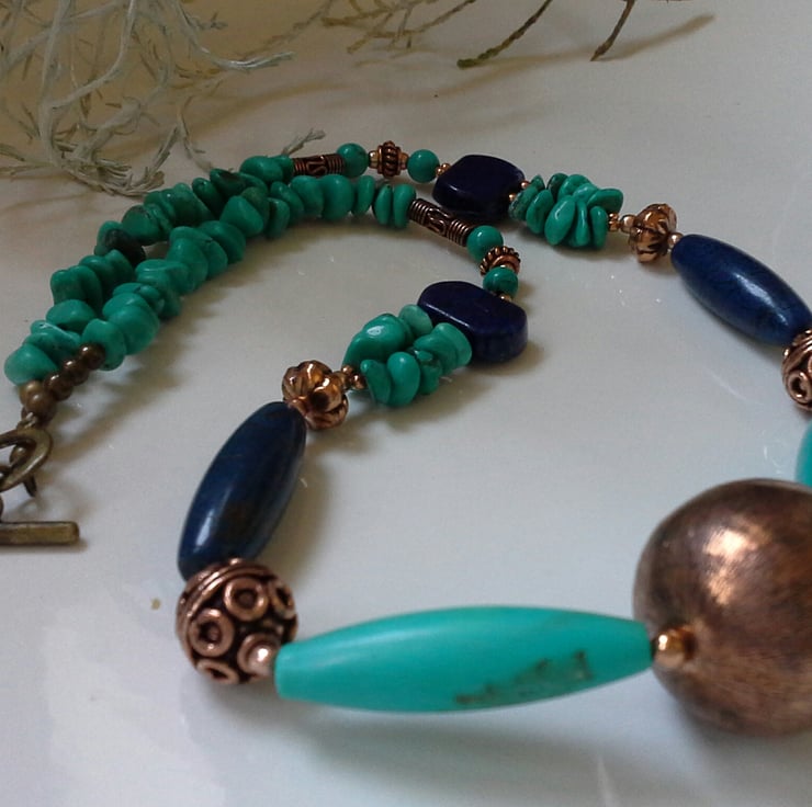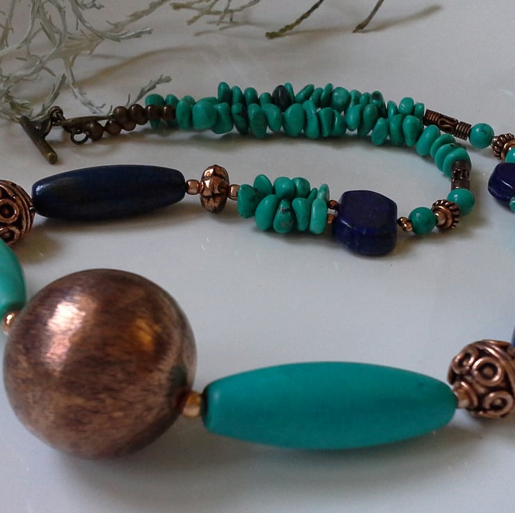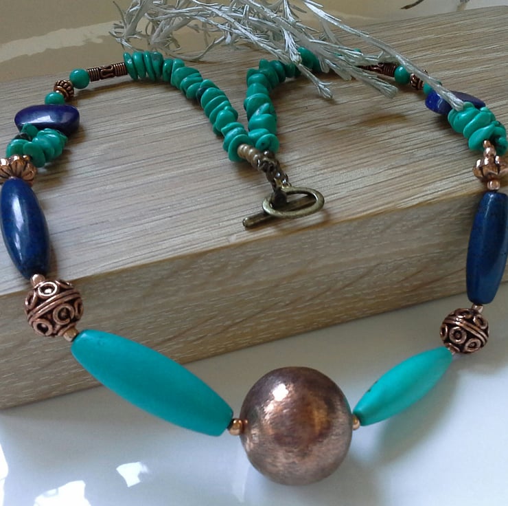 A fabulous eye catching necklace designed and hand crafted for those whom enjoy accessorising with colourful statement jewellery. The necklace has been created using one large copper centre bead with decorative copper beads, finished off with an antique look toggle style clasp. For the main construction coated professional stainless steel jewellers wire has been used for added strength and lasting durability.