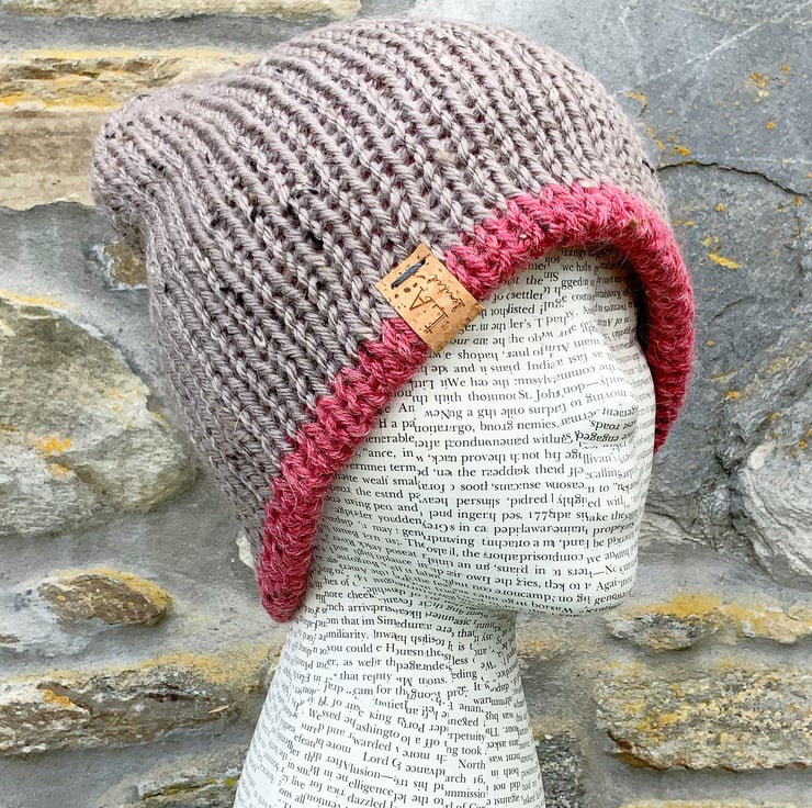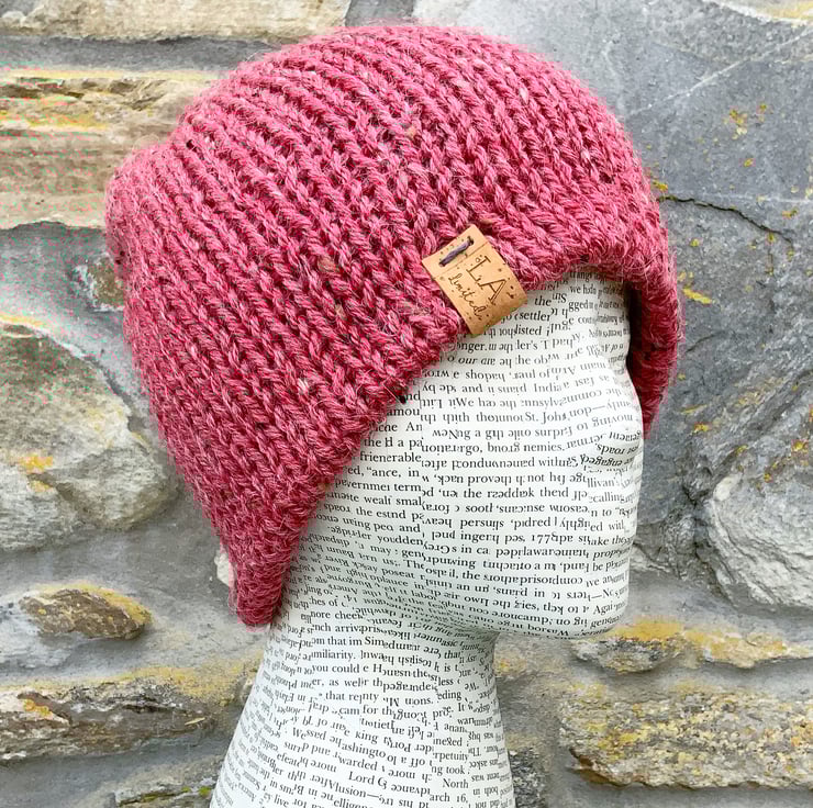 A very versatile hat that is cosy and warm. It has been knitted in a very soft chunky yarn, with shades of pink on one side and shades of brown to the other (77 percent Acrylic, 20 percent Alpaca, 3 percent Viscose).