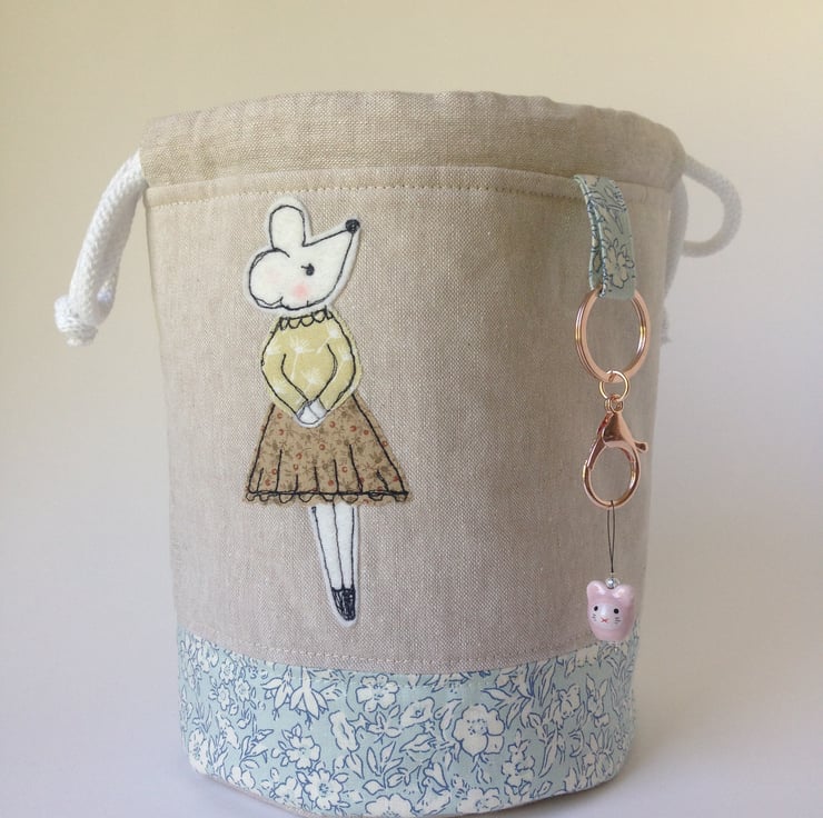 Hand crafted round based adorable little Draw string bag to keep your hand knitted socks or other small projects in.