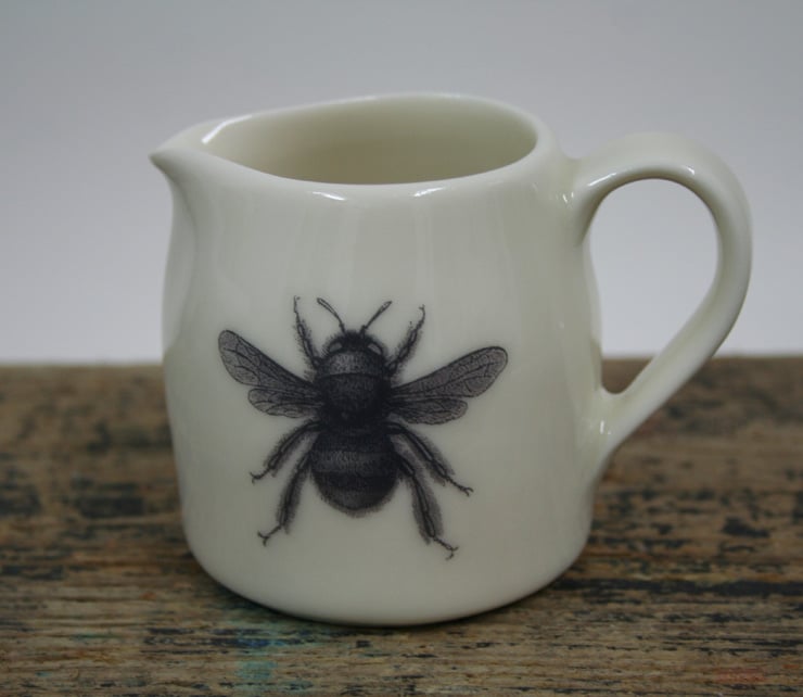 Hand thrown porcelain jug with handle and a bee image on one side. Glazed and fired at 1,240 degrees centigrade. Approximate measurements 7cm high and 7cm diameter at the base. It holds about 125ml. The lip is well formed to give a good pour! The jug is dishwasher / microwave / oven safe. The transfer has been fired on at 800 degrees centigrade.