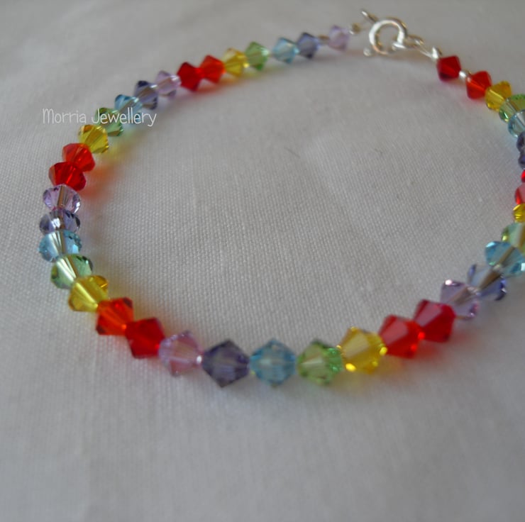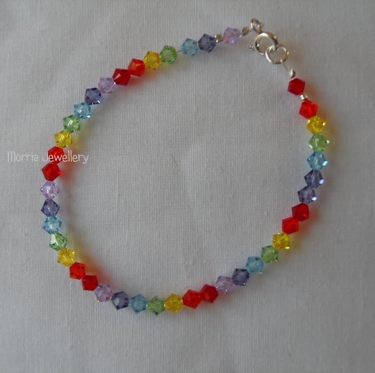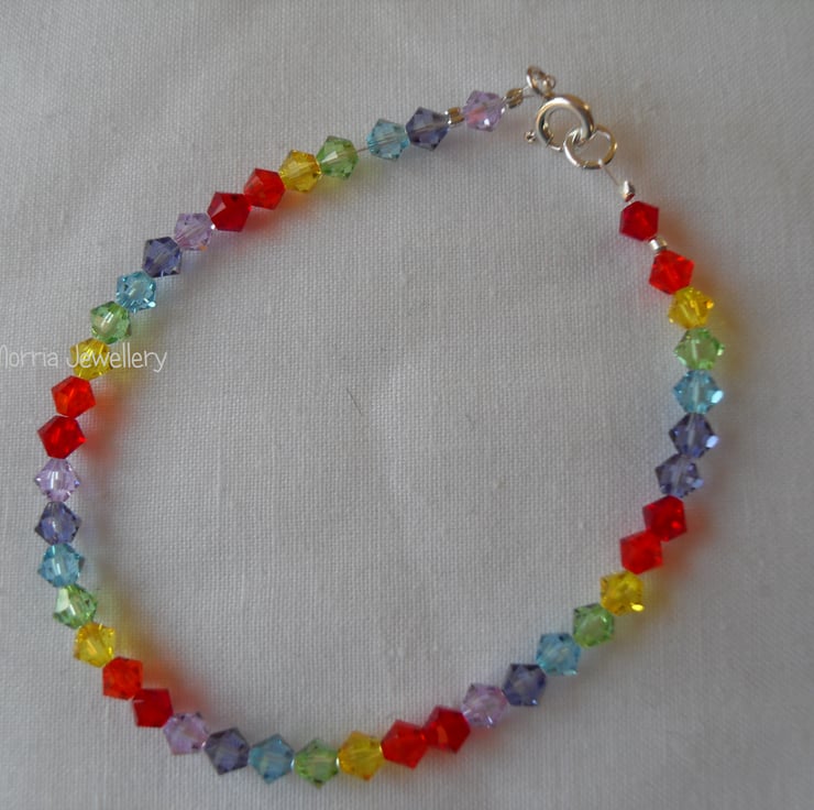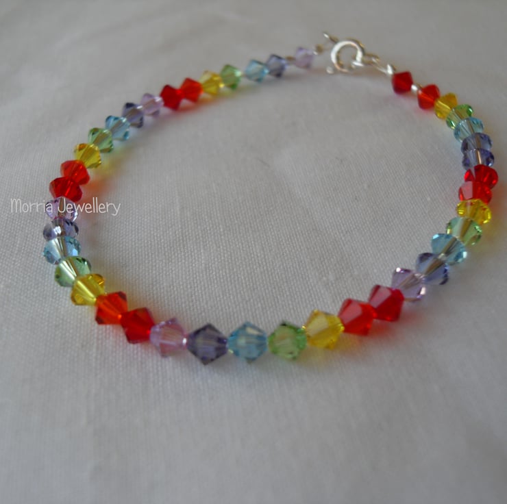 Beautiful 4mm high end bicone crystals are used to make this bracelet in rainbow colours. The bracelet is fastened with a sterling silver clasp and jump ring.