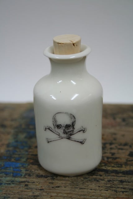 Hand thrown small porcelain bottle with poison wording and skull and bones image on the reverse. Includes a cork. Approximate size 7cm high and 4cm diameter at the base. Please note sizes may vary slightly due to the handmade nature.