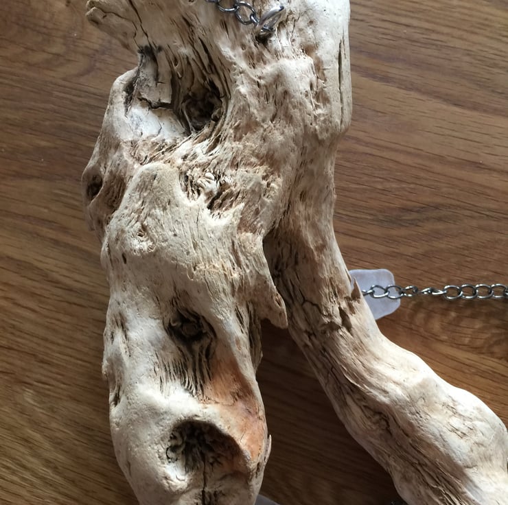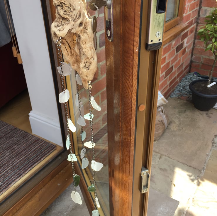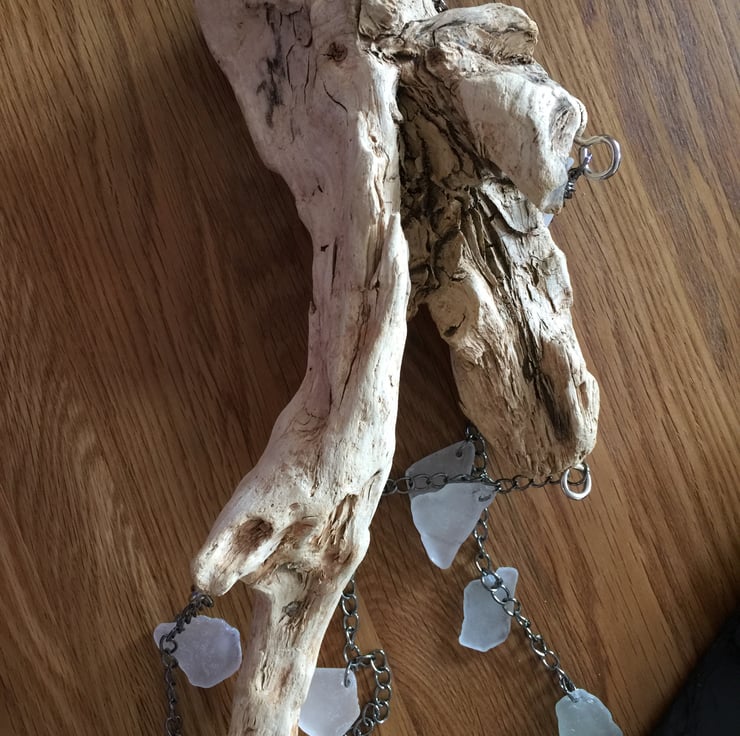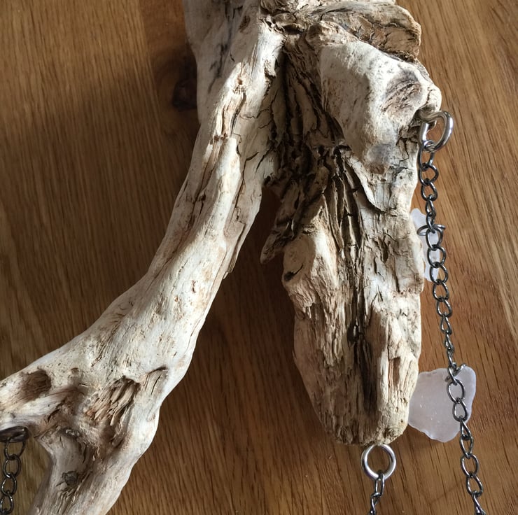 A suncatcher for the garden or a window made from a strange, gnarled and very dense piece of driftwood, home bleached, with three chain strands holding seaglass to catch the light. Bleaching the wood ensures any bugs are removed from the wood. This is a complete one-off piece due to the beach combing elements.