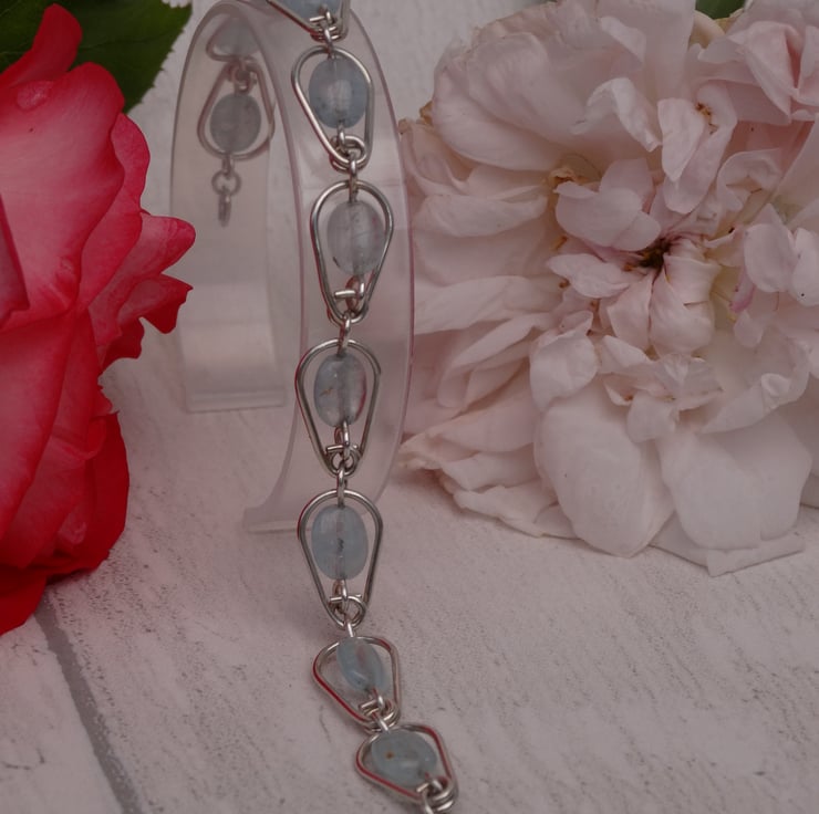 The oval aquamarine beads are approximately 0.7 cm in length and have been encased in an oval made from 1 mm sterling silver wire. The wire ovals are approximately 1.5 cm in length. 10 of these ovals make up the bracelet.