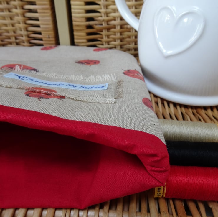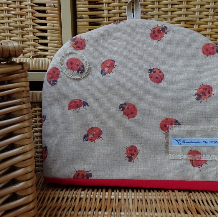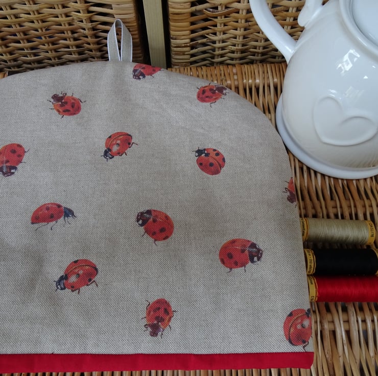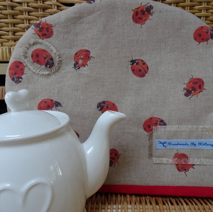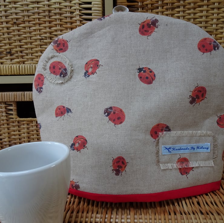This super cute ladybird fabric tea cosy would look great on any kitchen table or coffee table. Made from a cotton main fabric with a wadding inside and a red inside lining, it measures approximately 32cm wide by 26cm height. Suitable for a medium to large teapot. Also features a hanging hook, so that it can decorate your wall when not in use. Matching coasters in a set of 4 are available.