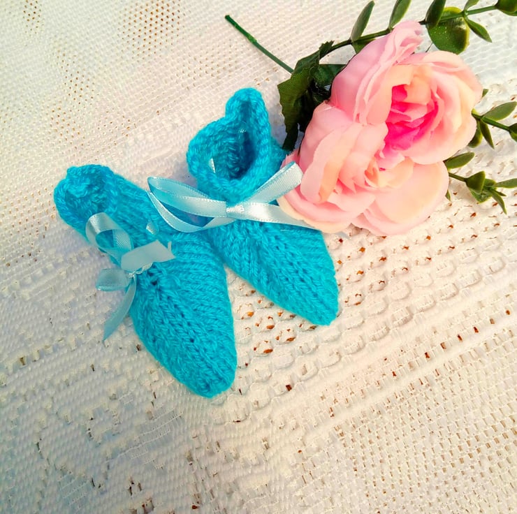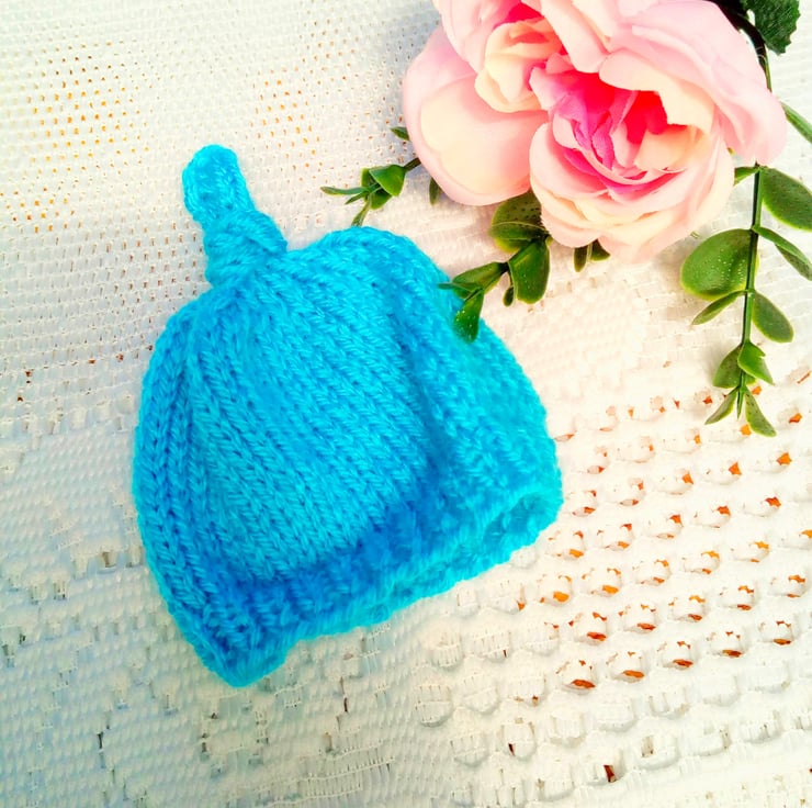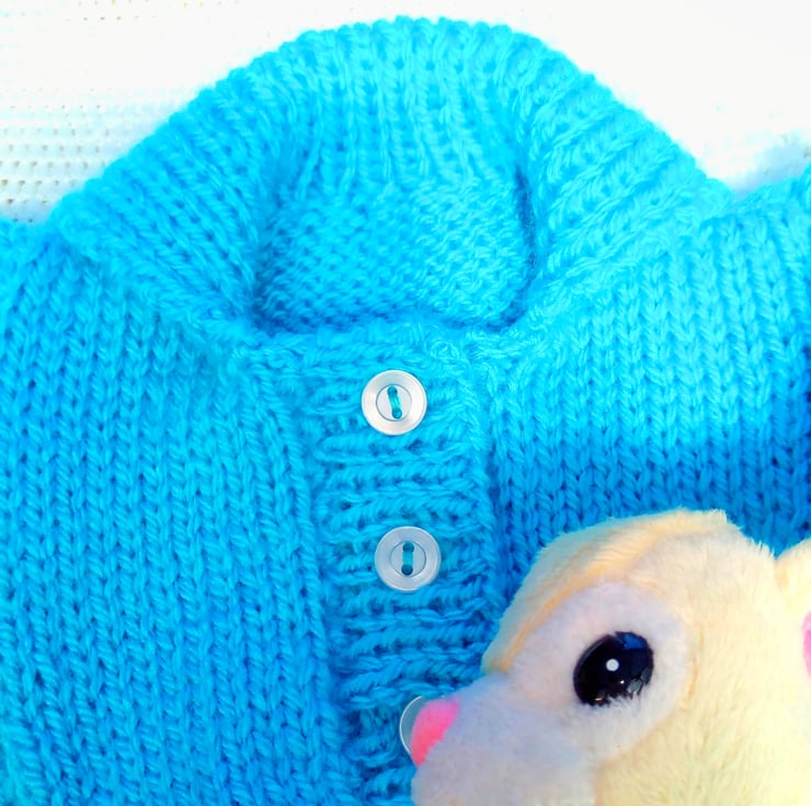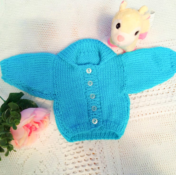 A cute 3 piece cardigan set for a premature baby comprising a cardigan, booties and a hat for a premature baby boy or girl. The set is knitted in double knitting weight yarn. It is in stock in this pretty turquoise colour but it can also be made for you in other colours. This will take approximately 1 - 2 weeks to produce and post to you.