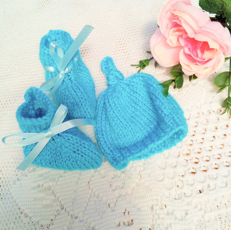 A cute 3 piece cardigan set for a premature baby comprising a cardigan, booties and a hat for a premature baby boy or girl. The set is knitted in double knitting weight yarn. It is in stock in this pretty turquoise colour but it can also be made for you in other colours. This will take approximately 1 - 2 weeks to produce and post to you.