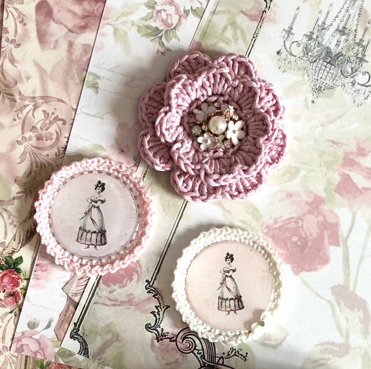 2 x of my little hand crocheted images .. both covered with clear dome epoxy resin stickers and one image I have added a cute resin white bow