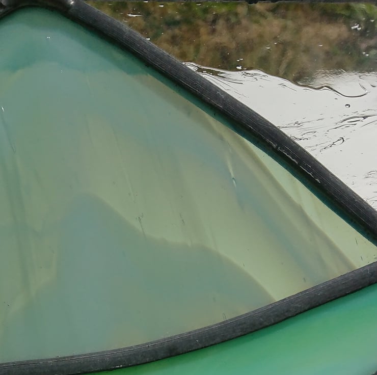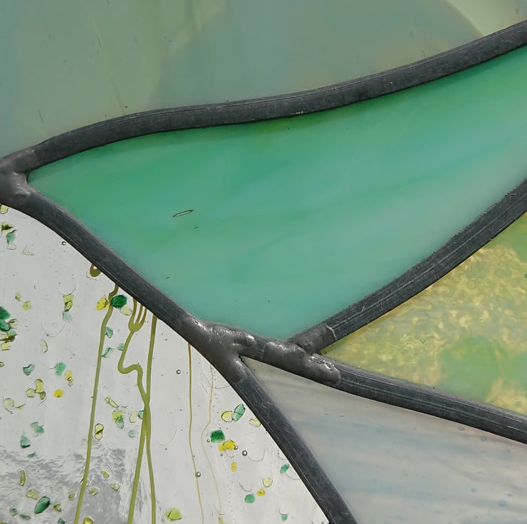 The sky and foreground are both textured clear glass, the foreground has beautiful stringers of yellow and green through it.