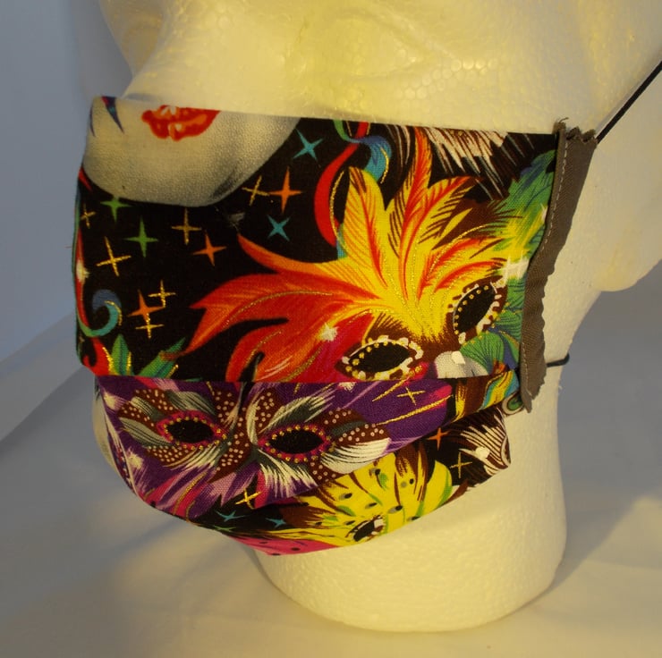 A washable double fabric face covering with interior pocket. It is made from 100% cotton and comes with pre threaded cotton ties or elastic ties for you to adjust to size, please make your choice in the selection option.