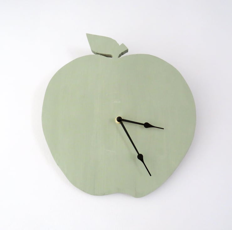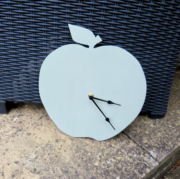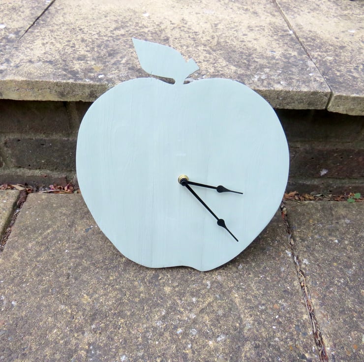 Made from reclaimed pallet wood, this rustic wall clock has been cut into an apple shape and then painted using a green chalk paint. It has been fitted with a battery operated clock mechanism with black hour and minute hands. The mechanism has an integral loop to allow you to hang the clock on a hook. Perfect for a kitchen, conservatory or garden room.