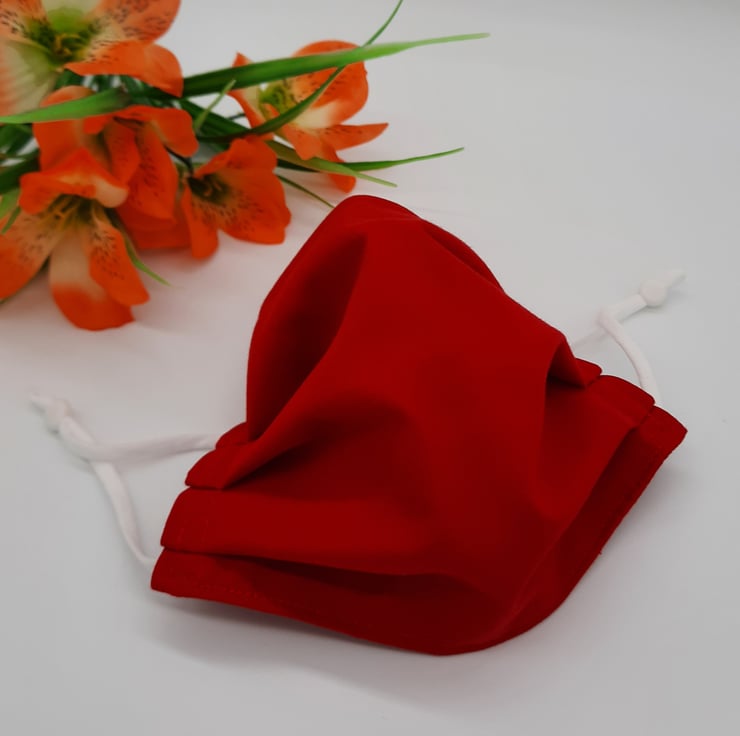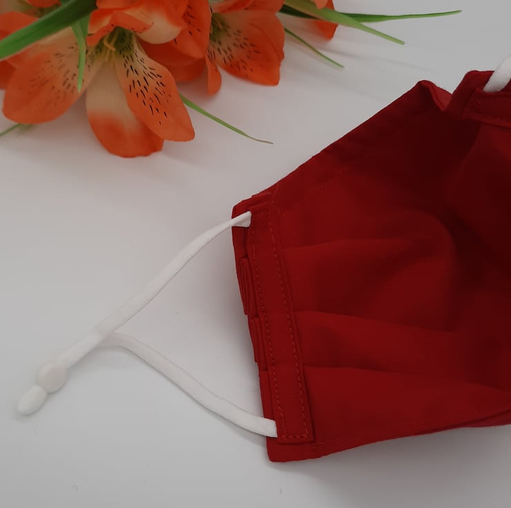 Face mask made using a red cotton fabric, adjustable soft white elastic and a 9cm flat bendable nose wire.
