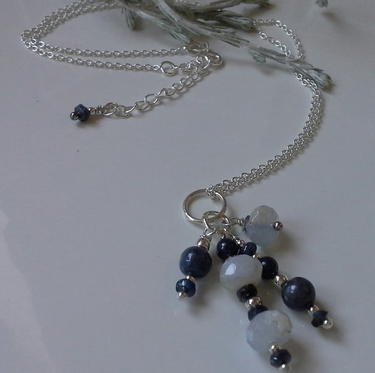 A sweet attractive cluster necklace designed and hand crafted using genuine blue sapphires and blue faceted opals. The necklace has been constructed using all 925 sterling silver components. The chain is included with a finished length of 18" inches.