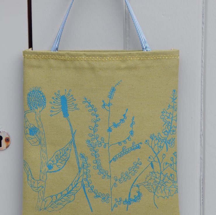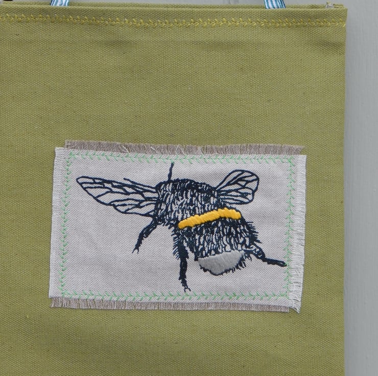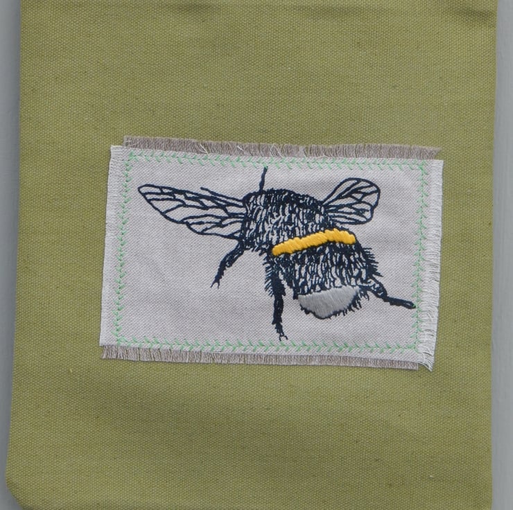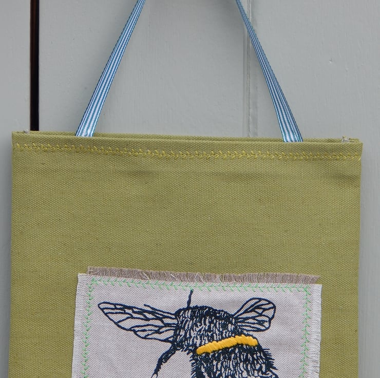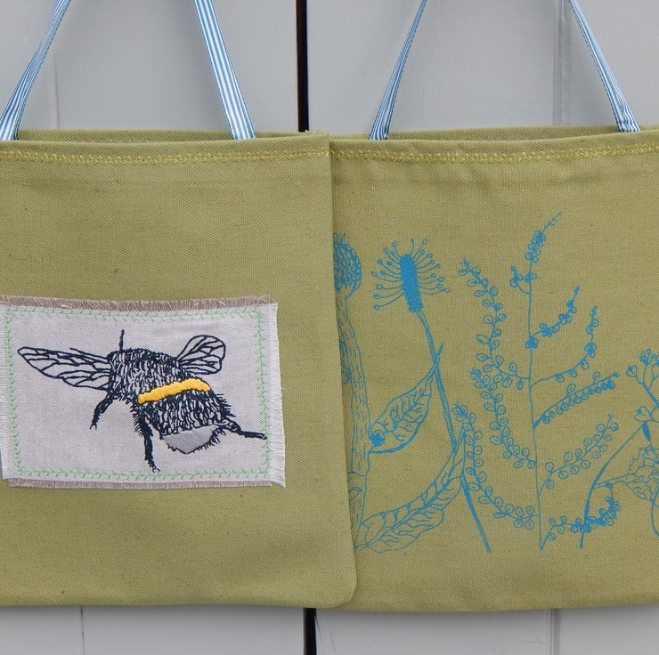 This is a small, light use canvas bag. It measures 28 cm in length by 24cm wide. There is a bee that has been screen printed onto beige cotton and then appliqued onto the front of the bag. The bee has hand embroidered yellow and light grey bands. On the back of the bag is a wild flower hedgerow scene printed in teal green.
