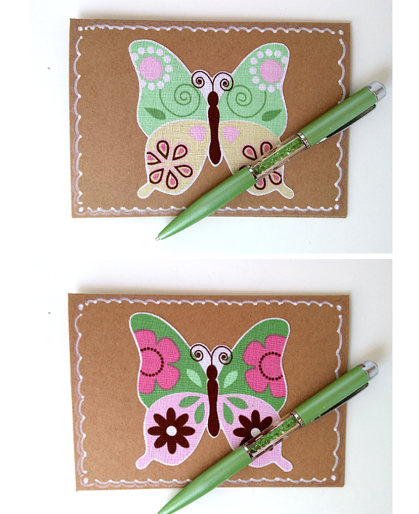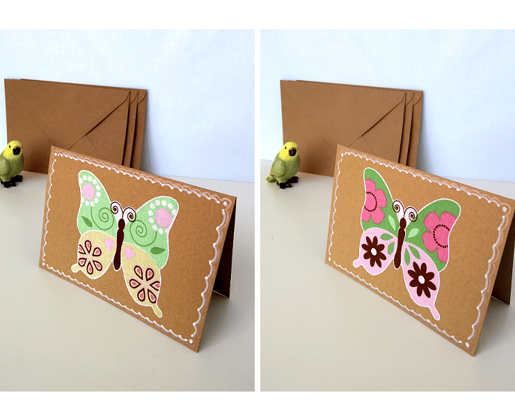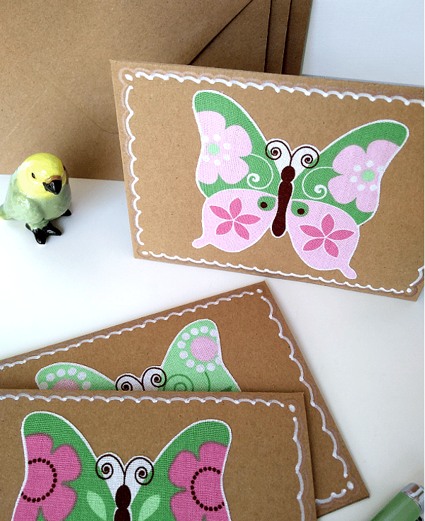 This listing is for a set of three blank cards with applique butterfly detail on the front in shades of green, pink and yellow. The colourful butterflies are positioned on elegantly decorated, brown cards. Each card has an ivory paper insert for your message.