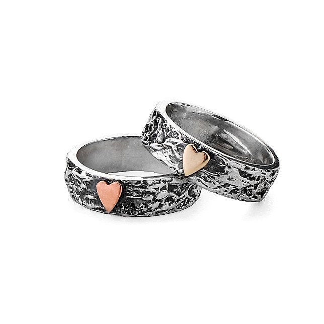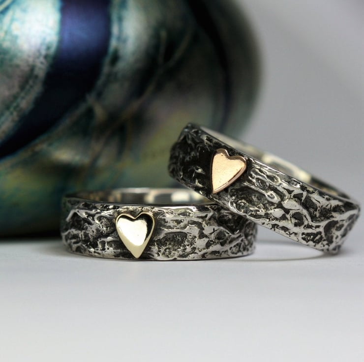 A beautiful handmade wide Textured Treasure Ring featuring a 9ct solid gold heart. Handcrafted from sterling silver and 9ct solid gold the ring band has been oxidized and polished back for the texture to pop. This bespoke ring has unusual texture Inspired by Landscape of The Lake District National Park, with its Mountain scenery, verdant valleys and major lakes with beautiful scenery and breathtaking views the Treasure Ring was formed. Whats not to love.