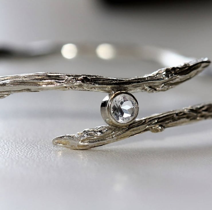 A stunning handmade silver twig Topaz bangle inspired by nature. The bangle has been hand carved and the result is this gorgeous deep textured bangle duplicating an old twig forest branch, featuring a White Topaz duplicating a water droplet