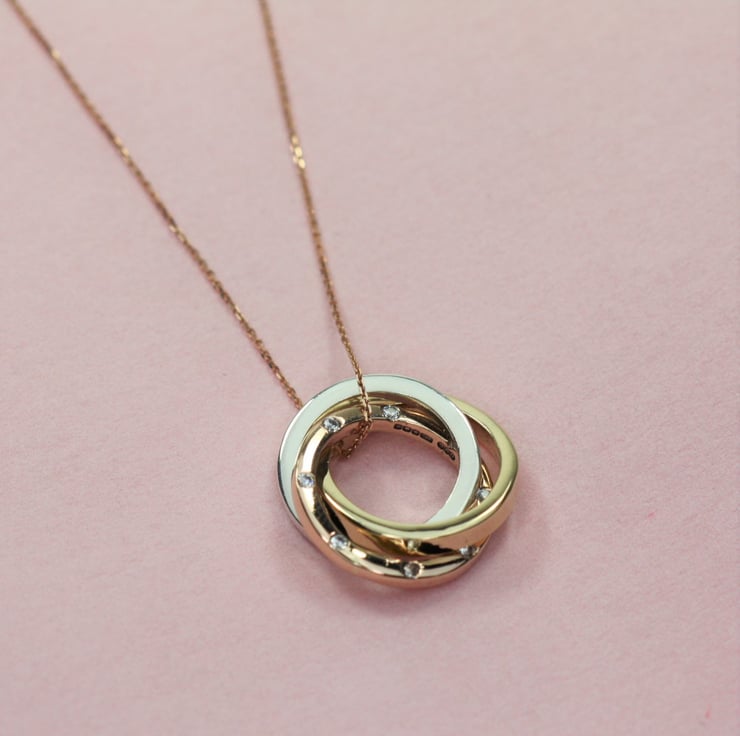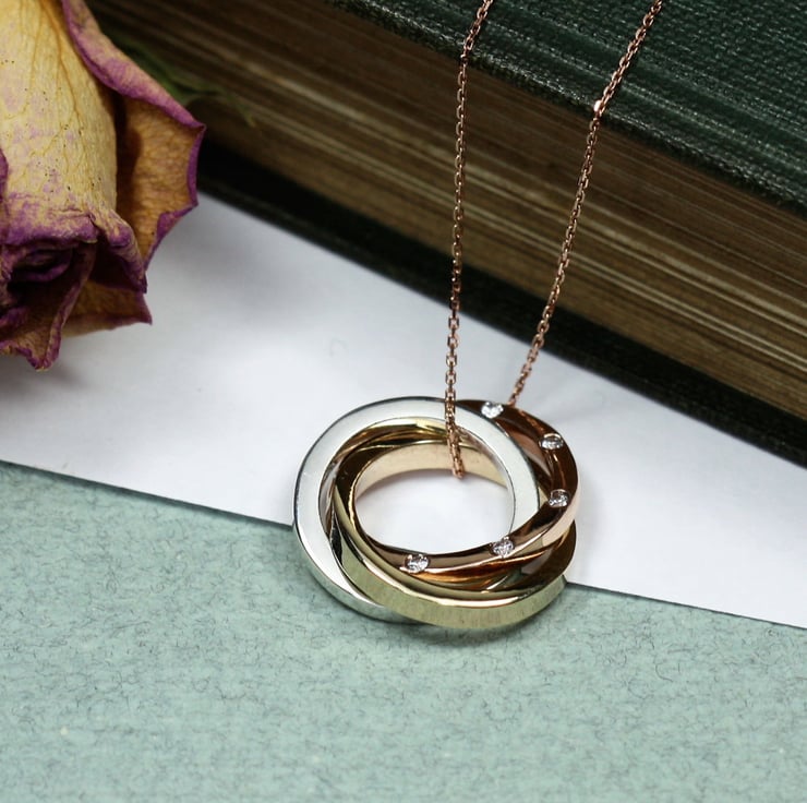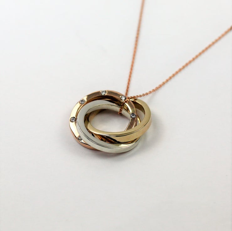 9ct solid mixed gold Russian necklace featuring beautiful white GVs diamonds. Three entwined handmade gold rings, one white gold, one yellow gold and one rose gold with eight hand set diamonds sways from a fine 9ct gold chain.