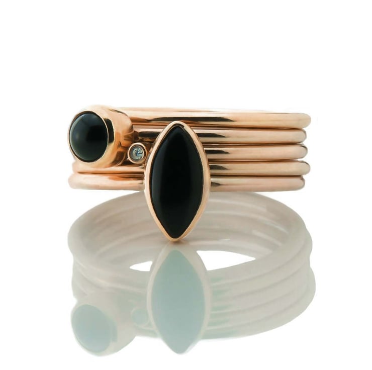 Peridot wild flower solid gold stacking rings, a stunning set of five 9ct gold rings featuring two Peridot gemstones, one round shaped and one marquise shaped with a single tube set diamond, two gold spacer rings. Add a touch of luxury to those fingers.