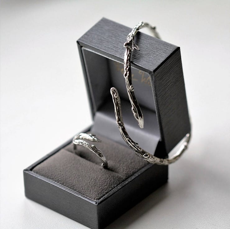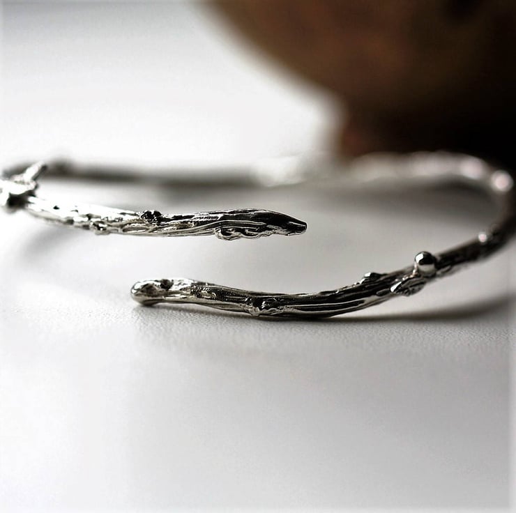 Sterling silver Twig bangle has been handmade with a deep texture from the mysterious branch of an old oak tree, deep in the forest in the North East. A stunning open bangle made from sterling silver which has been hand carved using traditional metalsmithing techniques which has created an unusual rustic texture.