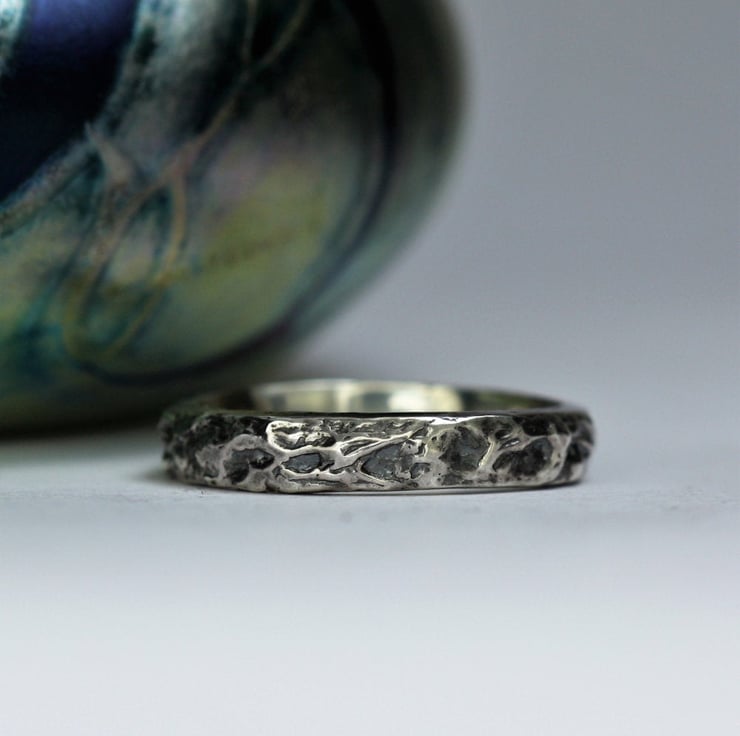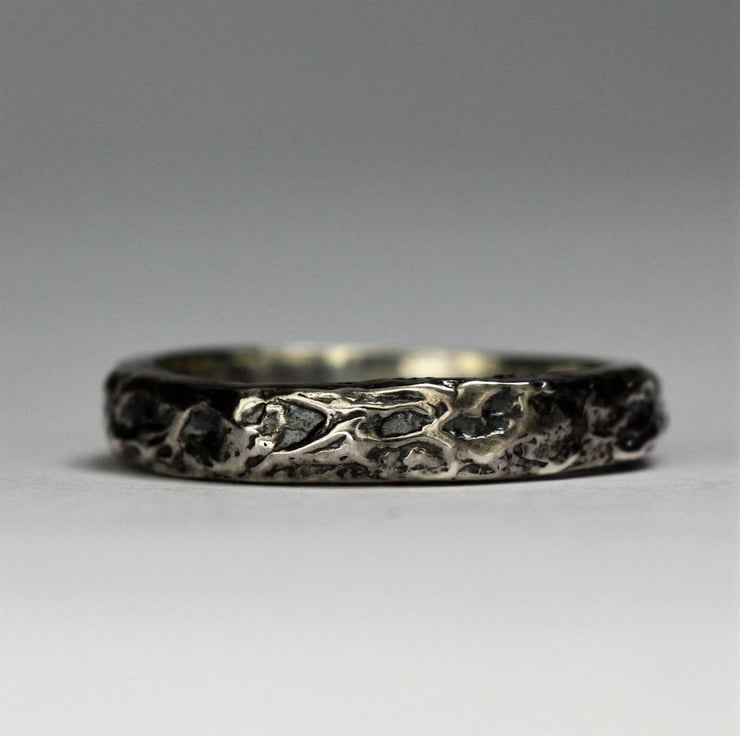 Rustic sterling silver organic wedding ring. Our handmade bespoke ring has a unusual texture and we oxidised it to make the raise areas stand out. 3.5 mm wide this is perfect as a his and hers wedding ring. Every Treasure stack together perfect for a truly unique stacking ring.