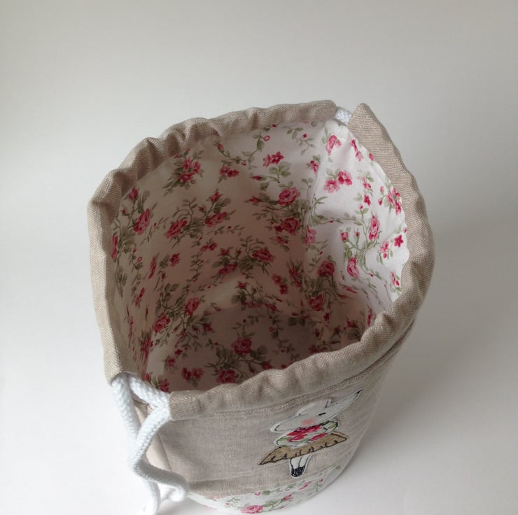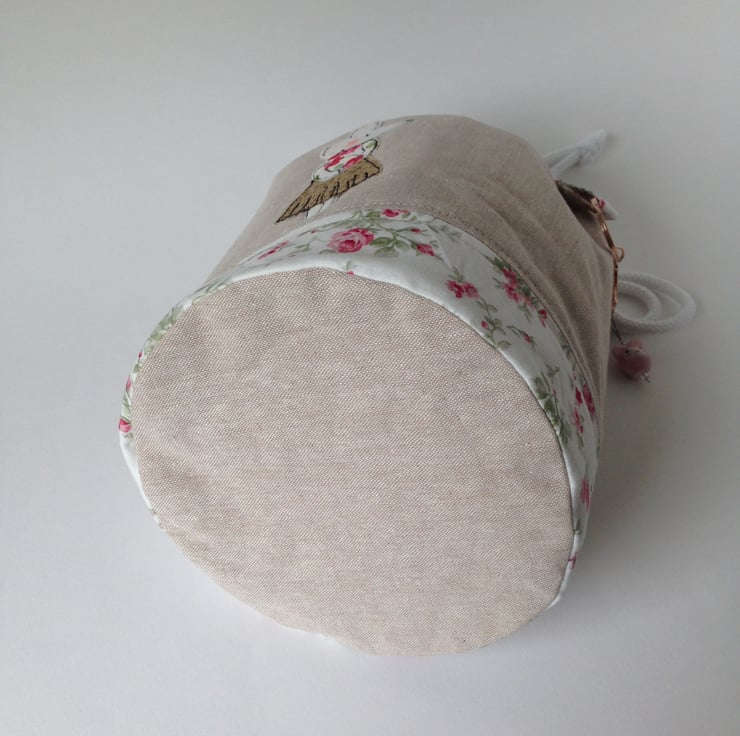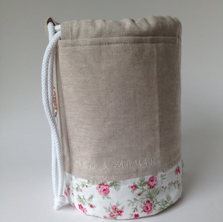 Hand crafted round based adorable little Draw string bag to keep your hand knitted socks or other small projects in.