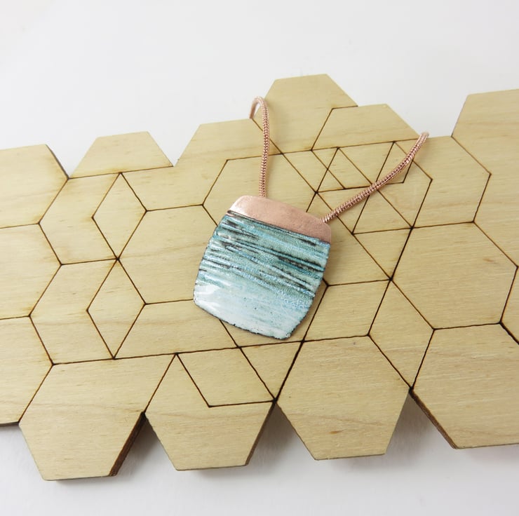 A copper rectangle measuring 22mm x 20mm has been textured in lines from the top. Layers of white and teal enamel have been painted on to the copper and fired several times in the kiln. The top section has been polished into a shiny copper and a loop is soldered on the back. The pendant is attached to a rose gold plated snake chain measuring 45cm.